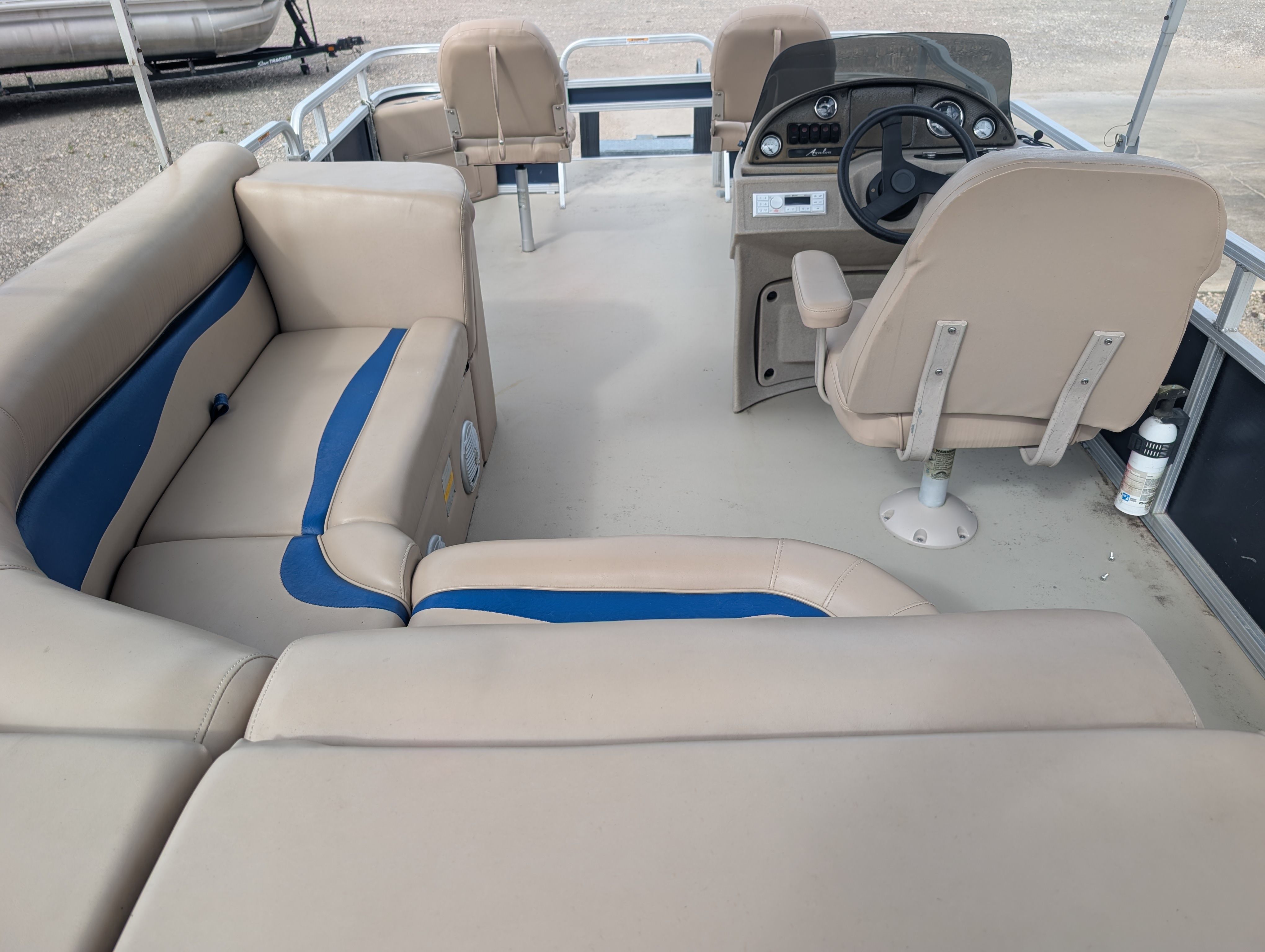 The Avalon LSV RF-18 comes equipped with a selection of special features designed to enhance your time on the water. The Bimini top offers shade and protection from the sun, creating a comfortable environment for relaxing or socializing, even on the brightest days. Enjoy your favorite tunes with the Bluetooth stereo system, which allows you to stream music wirelessly and set the perfect mood for any occasion. For anglers and those who love exploring, the Minn Kota I Pilot Trolling Motor provides precise control and effortless navigation, making fishing trips and leisurely cruises more enjoyable than ever.This pontoon boat’s layout is designed for maximum comfort and convenience, with spacious seating areas that invite conversation and relaxation. The open deck plan ensures easy movement throughout the boat, while the sturdy construction and quality materials reflect Avalon’s commitment to safety and longevity. As a used Avalon boat for sale, the LSV RF-18 offers a proven track record of performance and reliability, giving you peace of mind as you embark on new adventures.