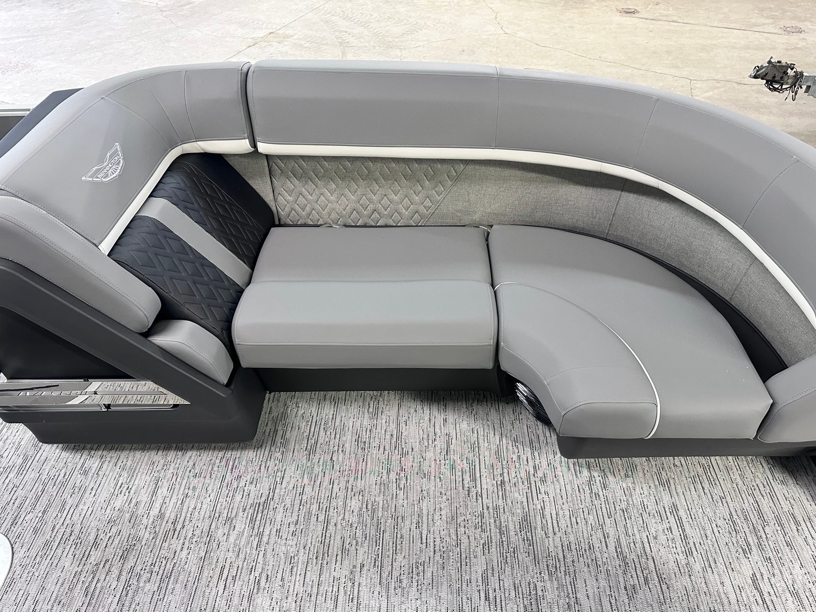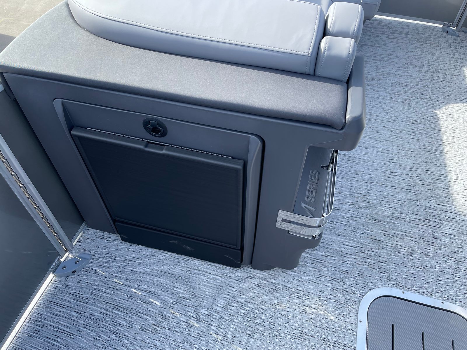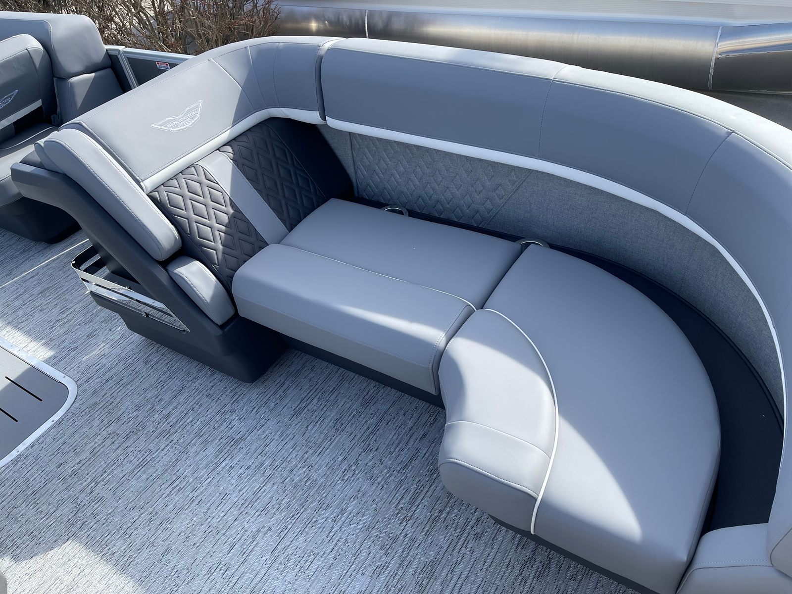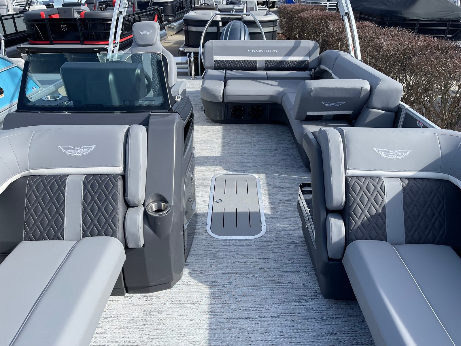 The Bennington 22 MSB SPS is packed with special features designed to enhance comfort, convenience, and fun. The electric power top curved Bimini provides effortless shade and protection from the sun, allowing you to relax in style no matter the weather. Bimini cable stays add stability and durability, ensuring your canopy remains secure even during breezy conditions. The base furniture M Series offers plush seating and ample room for guests, while the Zebrawood matte slate accents add a touch of sophistication to the interior. The ski tow bar opens up a world of watersports possibilities, making it easy to enjoy tubing, wakeboarding, or skiing with family and friends. The metal jacket tube protectant helps safeguard your pontoon’s structure, ensuring longevity and low maintenance. With the SPS Performance Package, you benefit from enhanced handling and fuel efficiency, while the 33-gallon transom direct fill system keeps you on the water longer.