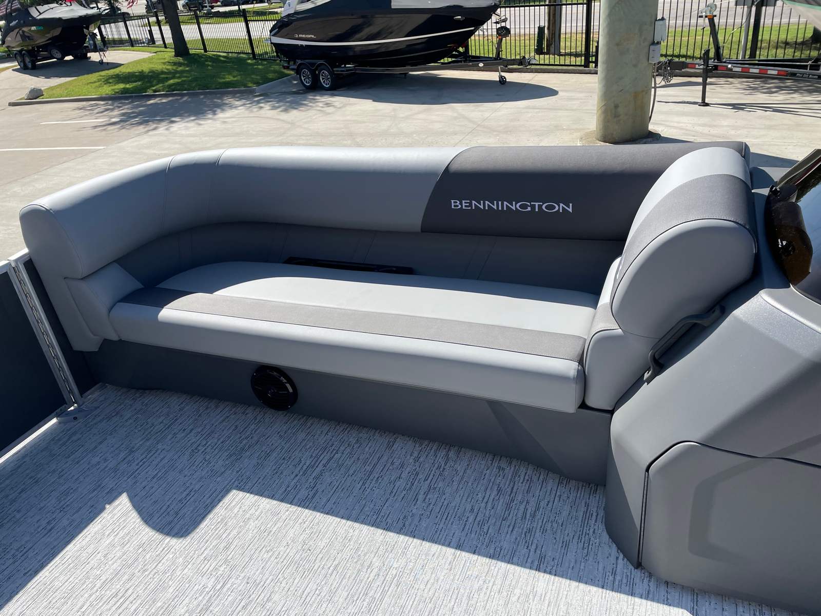 The 2026 Bennington 22 SS SPS stands out with its impressive length of nearly 23 feet, offering ample space for relaxation and recreation. As a new model, it showcases the latest advancements in pontoon design, ensuring you benefit from cutting-edge technology and modern aesthetics. The sleek Shadow Grey and Carbon color scheme, complemented by Ironwood dash accents, gives this Bennington boat for sale a sophisticated and contemporary look that will turn heads at any marina or lakeside dock.