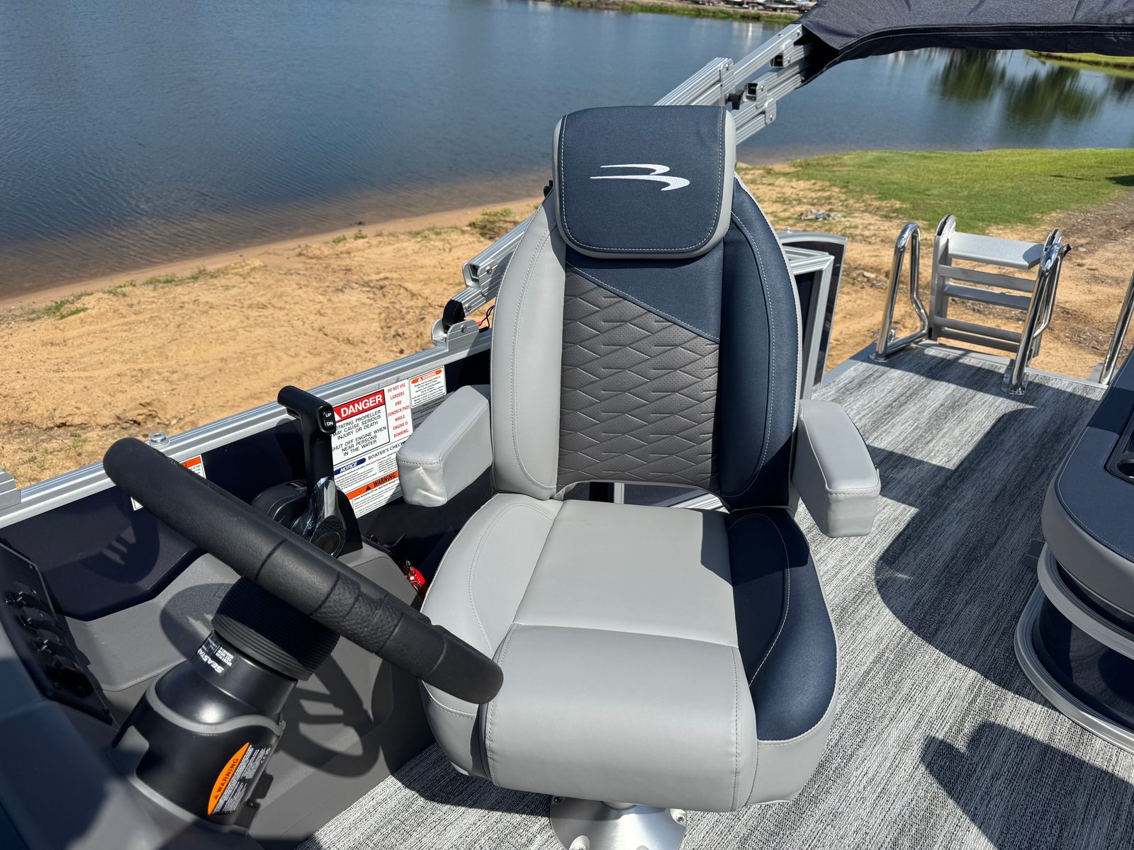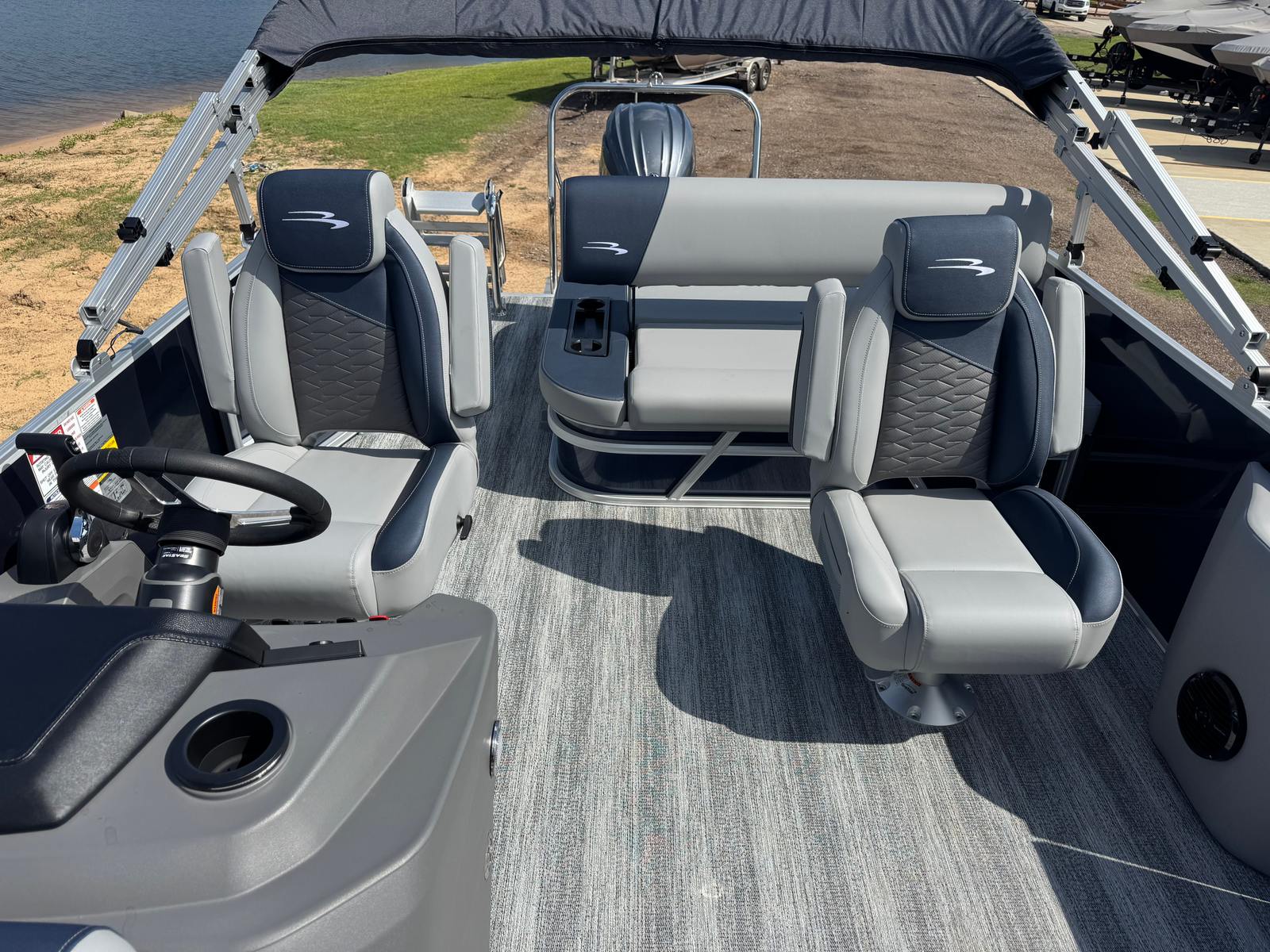 The Bennington 22 SSB SPS Pontoon is packed with thoughtful features that enhance both convenience and enjoyment. The dual battery switch with fuse provides reliable power management, ensuring your onboard electronics and accessories are always ready to go. The Lillipad Ladder offers easy access for swimmers and water sports enthusiasts, making it simple to get in and out of the water. The Benny Quick Fender Latch Kit in silver streamlines docking and mooring, allowing you to secure your pontoon quickly and safely. The combination of premium materials, such as the Ocean Blue Tweed canvas and metallic accents, creates a visually striking and durable exterior that’s built to withstand the elements.