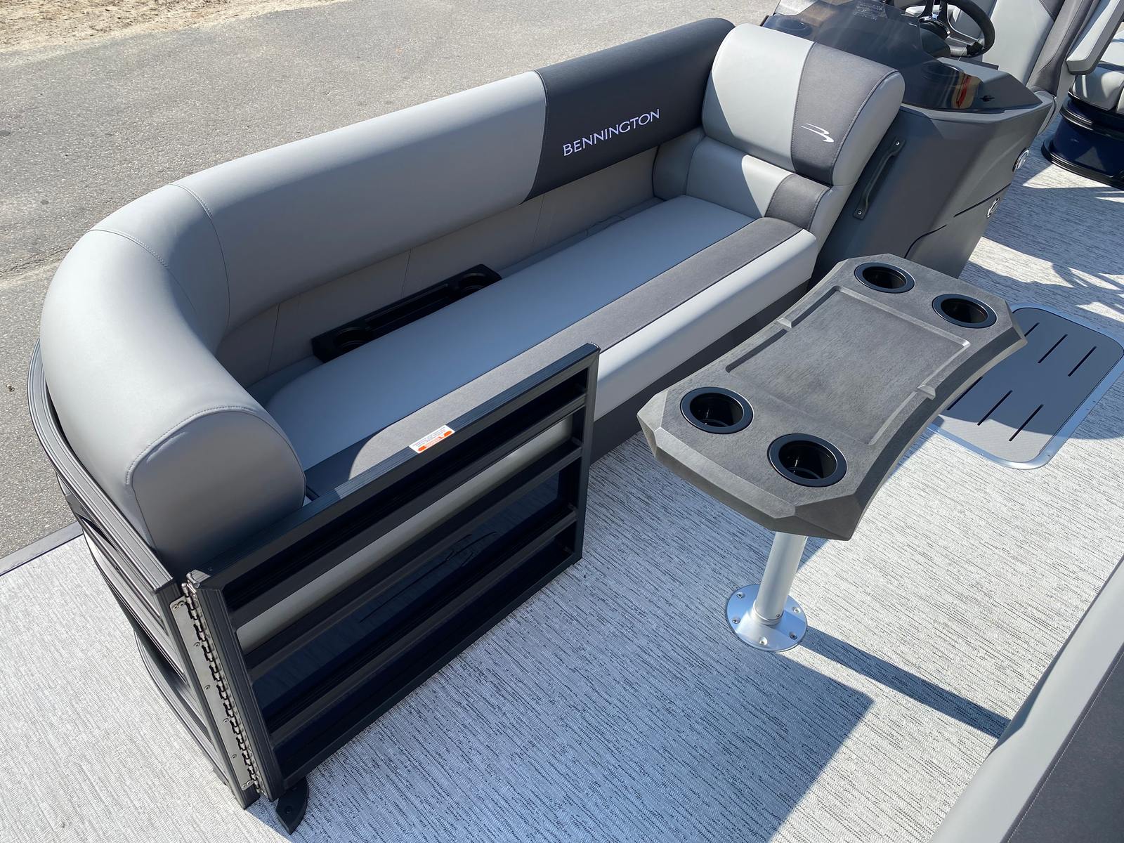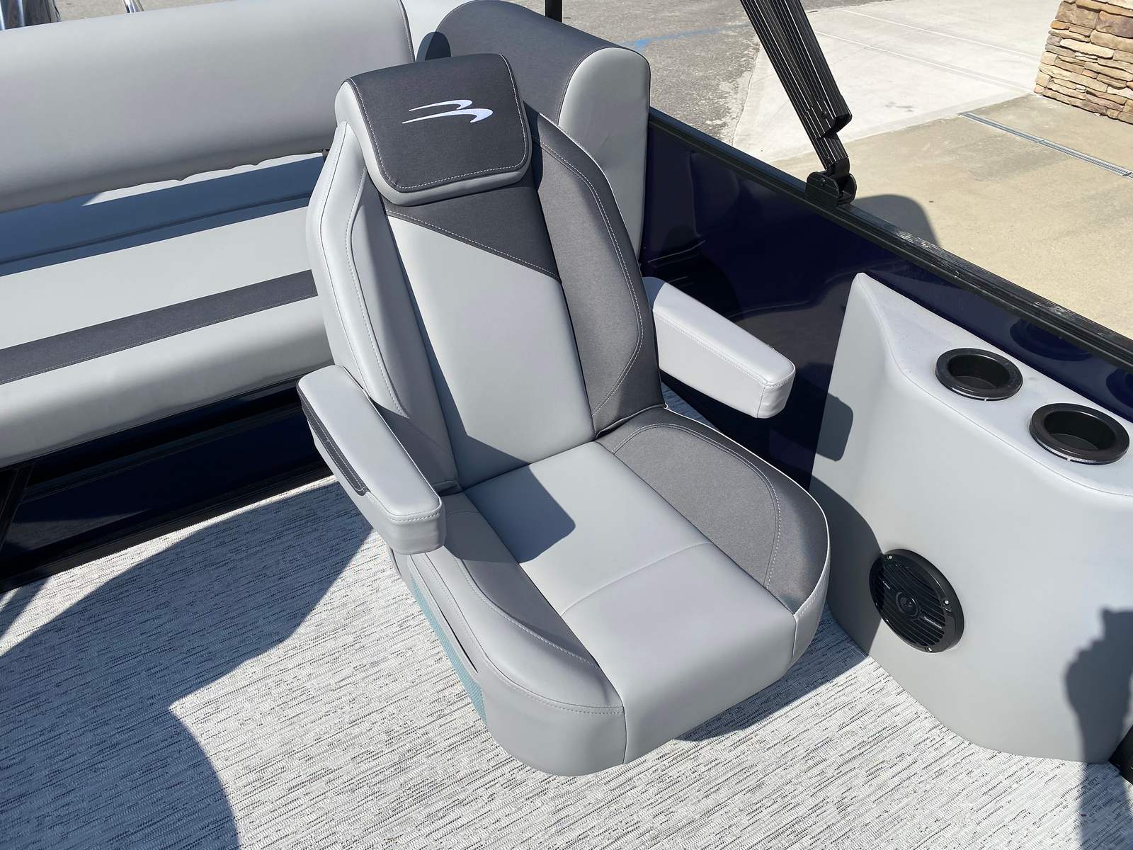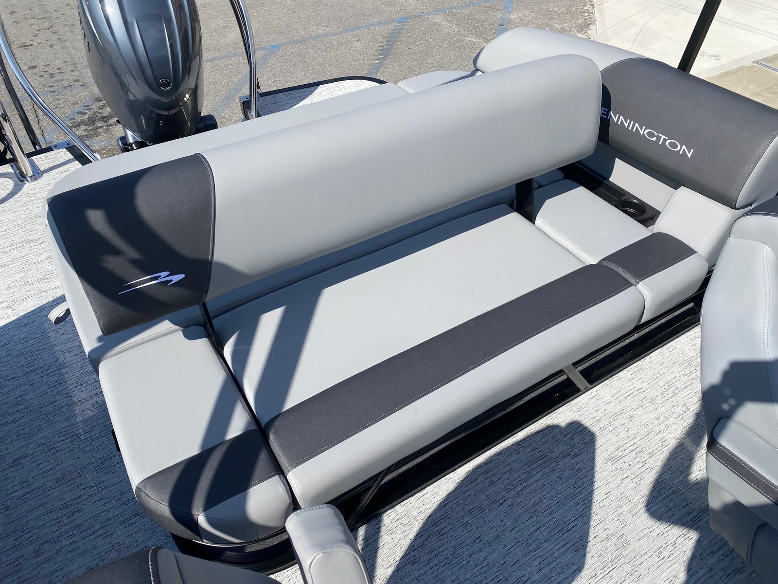 Step aboard the Bennington 22 SSB SPS and discover a world of comfort and style. The Serene Soft Touch Vinyl with Simtex Accents creates a plush, inviting atmosphere for all passengers, while the Midnight Black and Shadow Grey canvas adds a touch of elegance and protection from the elements. The Blackout Logos give the boat a sleek, modern look that is sure to turn heads wherever you go. With a single switch battery system, you can easily manage your power needs, ensuring a hassle-free day on the water.The thoughtful design extends to every detail, from the spacious deck layout to the premium materials used throughout. The combination of Smooth Midnight Blue panels and Smooth Metallic Silver accents creates a striking visual impact, while the Shadow Grey/Mythos Grey base and accent colors provide a sophisticated backdrop for your adventures. Every element of this pontoon boat is crafted to enhance your time on the water, making it a standout choice for those seeking a Bennington boat for sale.