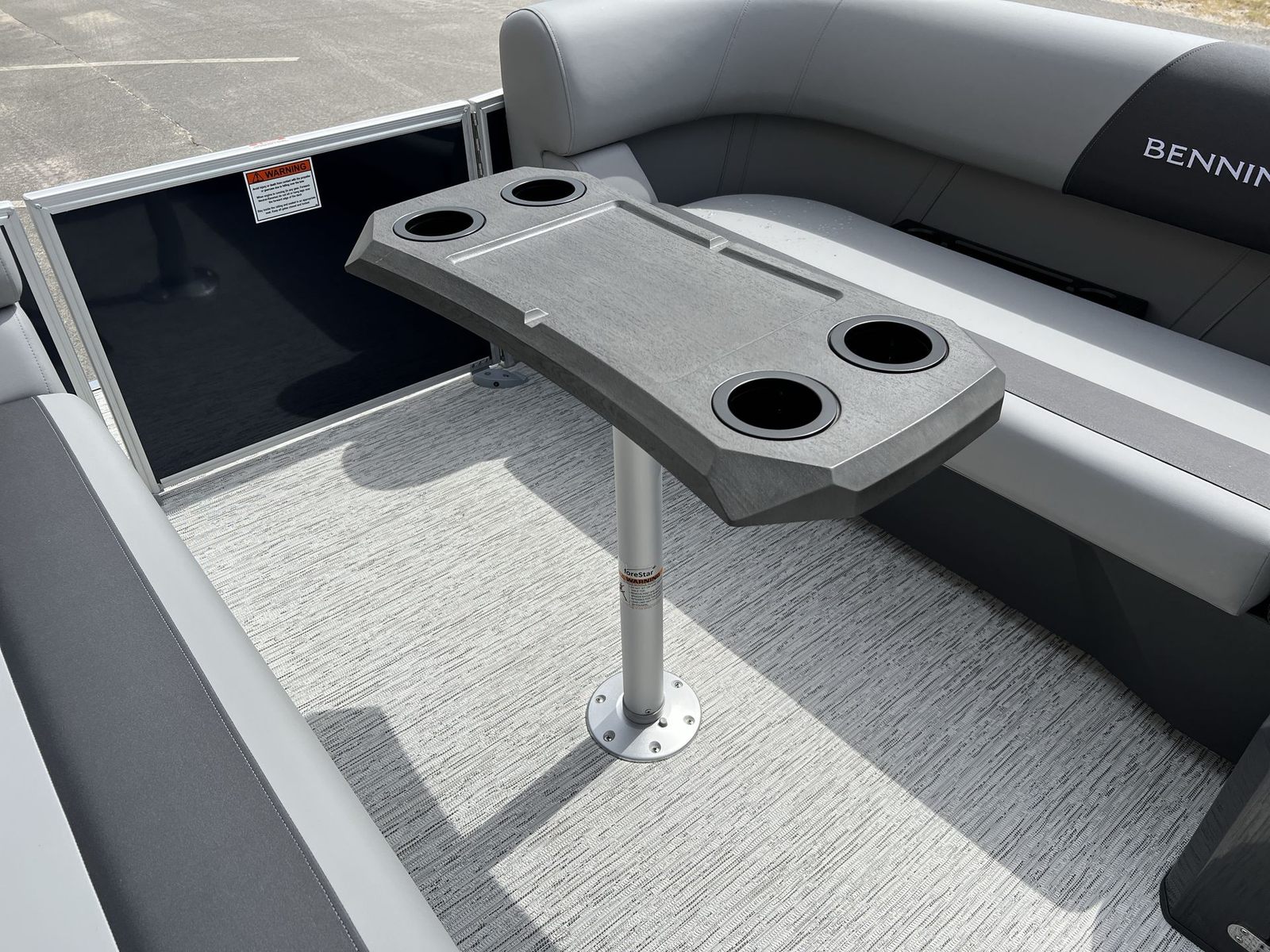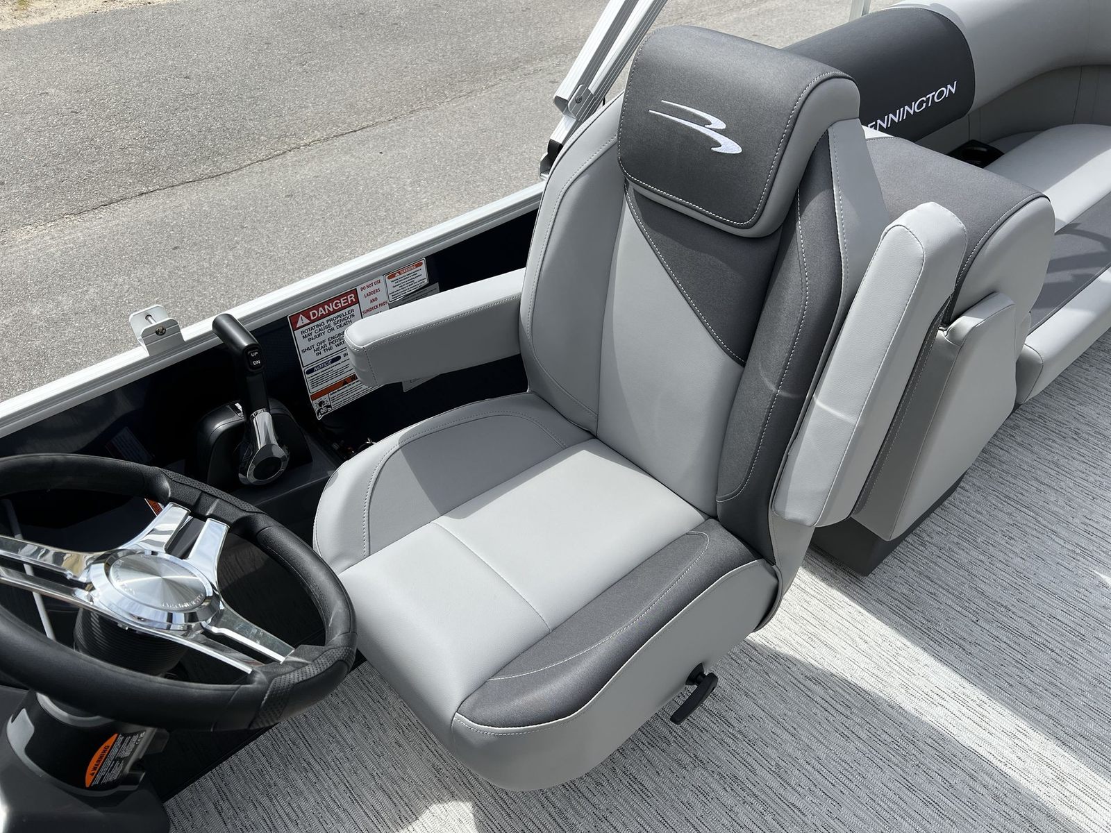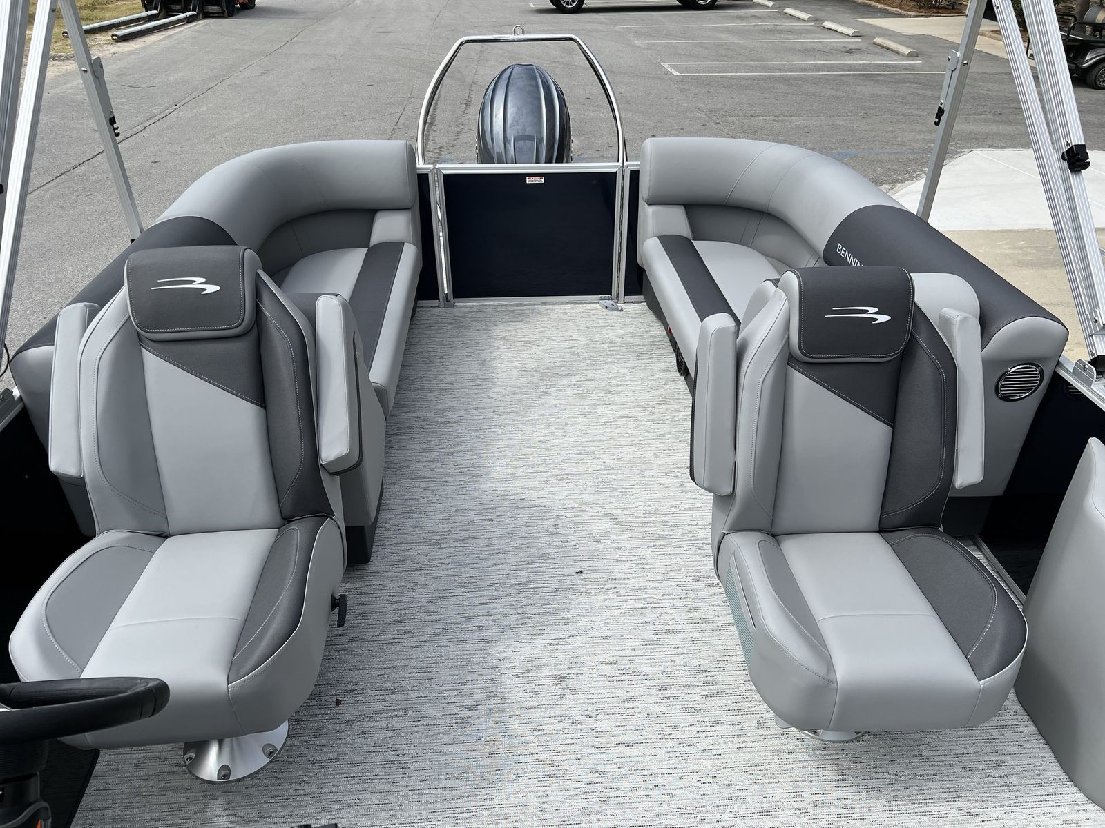 Step aboard the Bennington 22 SSR SPS and discover a world of comfort and innovation. The Serene Soft Touch Vinyl with Simtex accents provides a plush, inviting seating experience, while the Shadow Gray color scheme and Ironwood dash accent create a sophisticated atmosphere. The extended aft deck, finished with standard trim, offers additional space for relaxation and activities, complemented by the ski tow bar for those who love water sports. Dimensional brusher silver logos add a touch of elegance, and the midnight blue canvas ensures protection from the elements while enhancing the boat’s visual appeal. The smooth, no-accent design keeps the look clean and modern, making this pontoon boat for sale a true standout on any waterway.