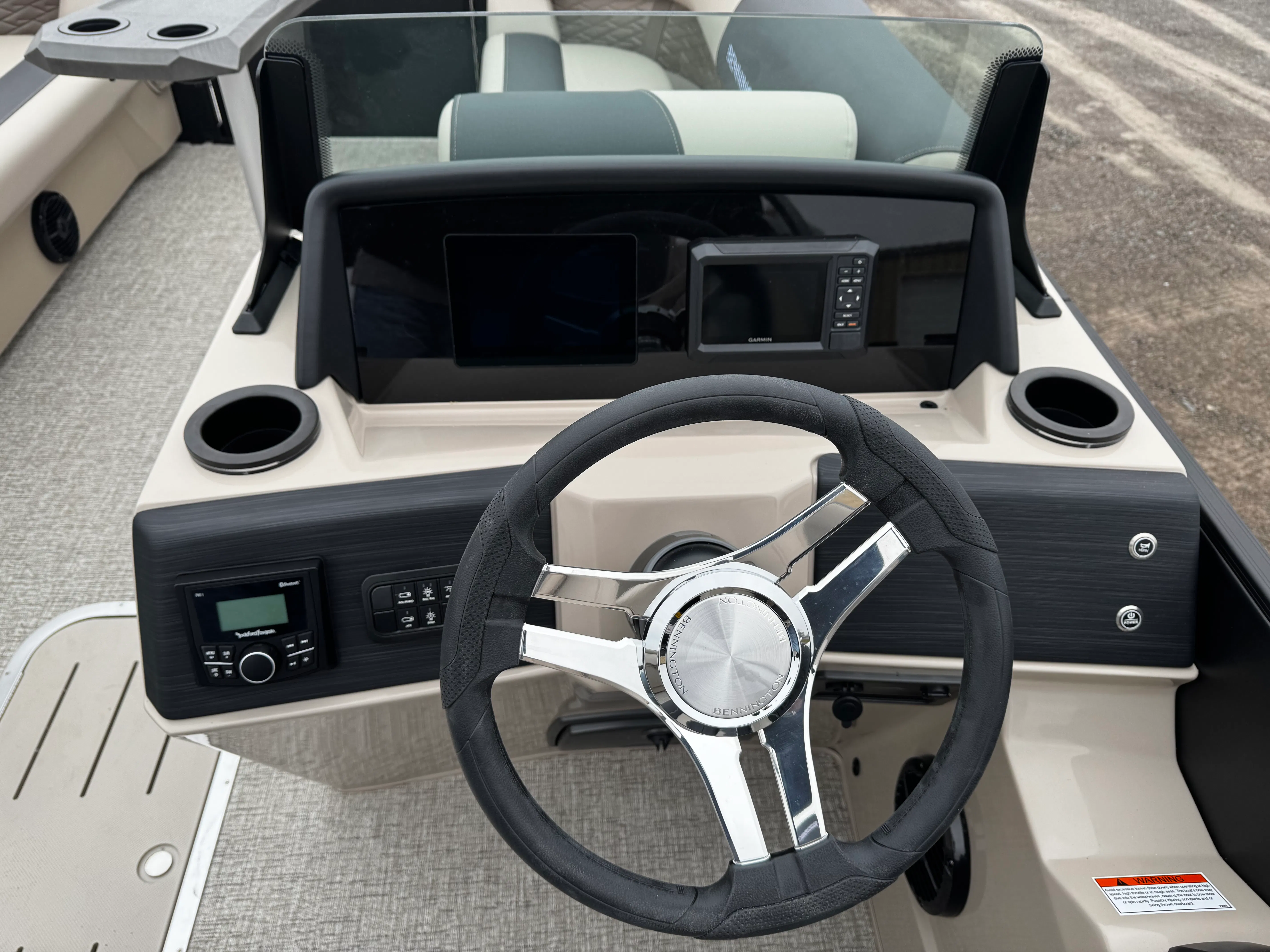 The Bennington 22 SSR SPS is loaded with premium features designed to elevate your time on the water. The removable flag pole with an American flag adds a patriotic touch, perfect for holiday weekends and special occasions. The single-switch battery system offers convenience and peace of mind, ensuring your boat is always ready for adventure.Aesthetically, the Blackout Logos and Blackout Luxe Package give this pontoon a sophisticated, modern look that turns heads wherever you go. The Accent in Smooth Metallic Sorrel and the Canvas in Midnight Black create a striking visual contrast, while the Dolce upholstery and Ironwood Dash Accent add a touch of elegance and comfort to the interior. Every detail is thoughtfully crafted to enhance both the visual appeal and the onboard experience.