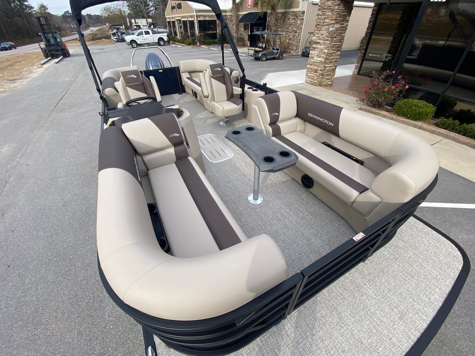 The Bennington 22 SSR SPS is loaded with special features that enhance both its appearance and functionality. The striking Panel in Midnight Blue, complemented by Smooth Satin Black accents, gives this pontoon a modern, upscale look. The Base and Accent in Dolce/Espresso, along with Dolce upholstery, create a warm and inviting atmosphere throughout the boat. The Console Dolce adds a touch of sophistication to the helm, ensuring that every detail is thoughtfully designed.For those who appreciate style, the Blackout Logos provide a sleek, contemporary finish, while the Canvas in Midnight Black offers both protection and aesthetic appeal. The single battery switch simplifies power management, allowing you to focus on enjoying your time on the water. Every element of the Bennington 22 SSR SPS is crafted to deliver a premium boating experience, making it a top contender among pontoon boats for sale.