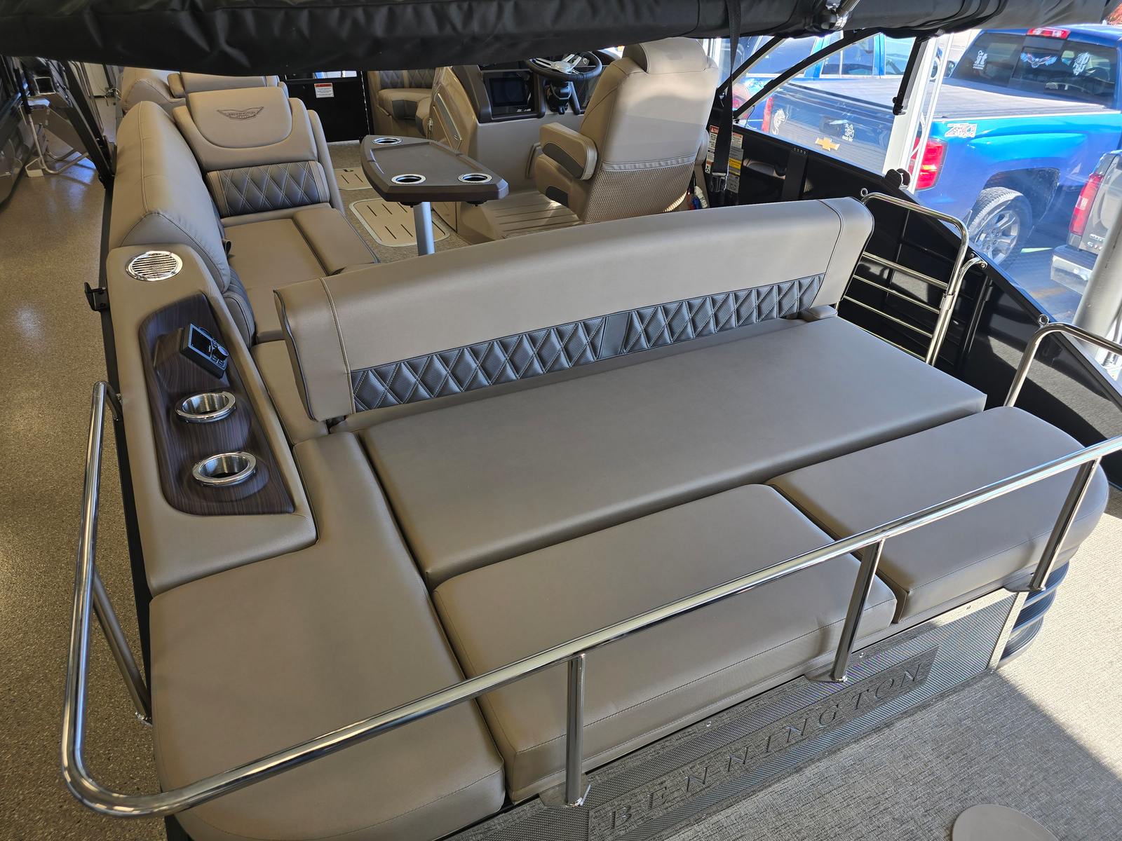 This Bennington boat for sale is loaded with premium features that elevate your boating experience. The removable flag pole with an American flag adds a patriotic touch, perfect for holiday outings and special occasions. The power hydraulic assist steering enhances control and reduces fatigue, allowing you to focus on fun and relaxation. For music lovers, the aft stereo control unit lets you manage your playlist from the rear of the boat, ensuring the perfect soundtrack for every adventure.Accent lighting creates a warm and inviting ambiance as the sun sets, while the blackout logos and midnight black canvas give the boat a sleek, modern appearance. The electric power top curved LXS bimini provides shade at the touch of a button, offering protection from the sun without interrupting your day on the water. The platinum Simtex upholstery, paired with the pillowtop diamond-stitched upgrade, delivers unmatched comfort and sophistication, making every seat the best in the house. The stainless steel rub rail not only adds a touch of elegance but also protects your investment from everyday bumps and scrapes.