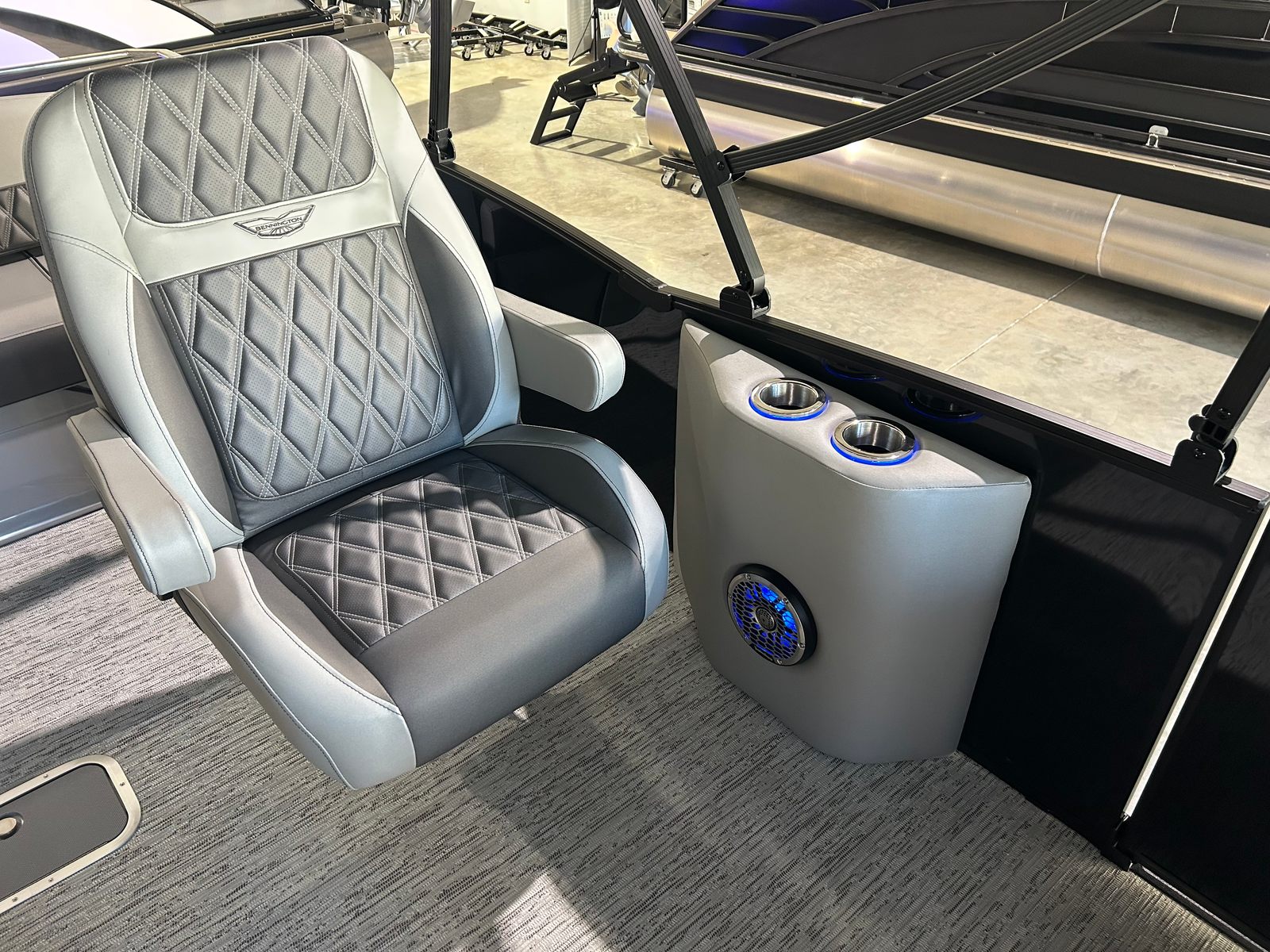 The 2025 Bennington 23 RSB ESP pontoon is a testament to Bennington’s commitment to quality and craftsmanship. Measuring an impressive 26.25 feet in length, this pontoon offers ample space for family and friends, making it the ideal choice for social outings and relaxing escapes. Its sleek profile and modern design are complemented by the striking Smooth Gemini Black paneling and Perforated Metallic Carbon interior accents, ensuring you’ll turn heads wherever you go. As a new pontoon boat for sale, it promises pristine condition and the latest advancements in marine technology.