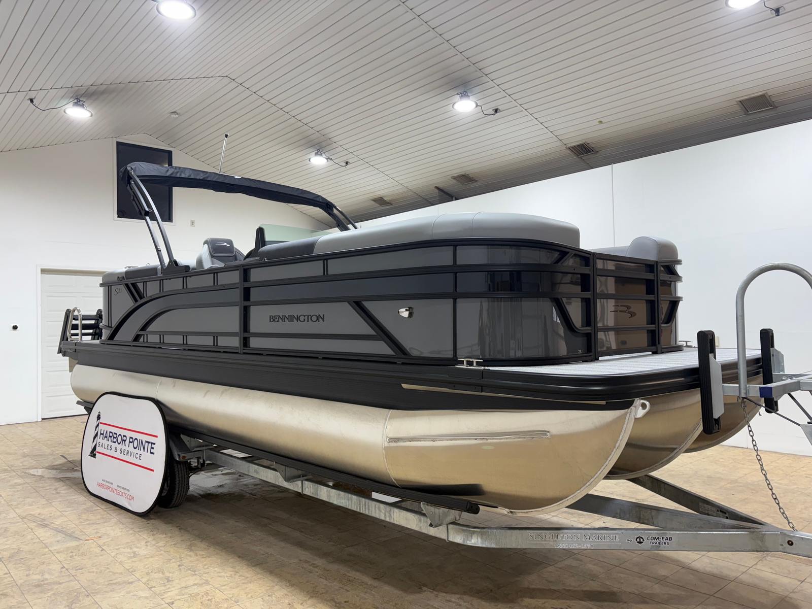 The 2026 Bennington 23 SSR SPS Pontoon is a brand-new model that embodies the renowned craftsmanship and innovation Bennington is known for. Measuring an impressive 22.33 feet in length, this pontoon boat provides ample space for entertaining, relaxing, and enjoying the water in style. Its sleek profile, highlighted by blackout logos and the Blackout Luxe Package (S), ensures you’ll turn heads wherever you go. The combination of Midnight Black canvas and Shadow Gray accents gives the boat a sophisticated, modern look that stands out on any lake or river.