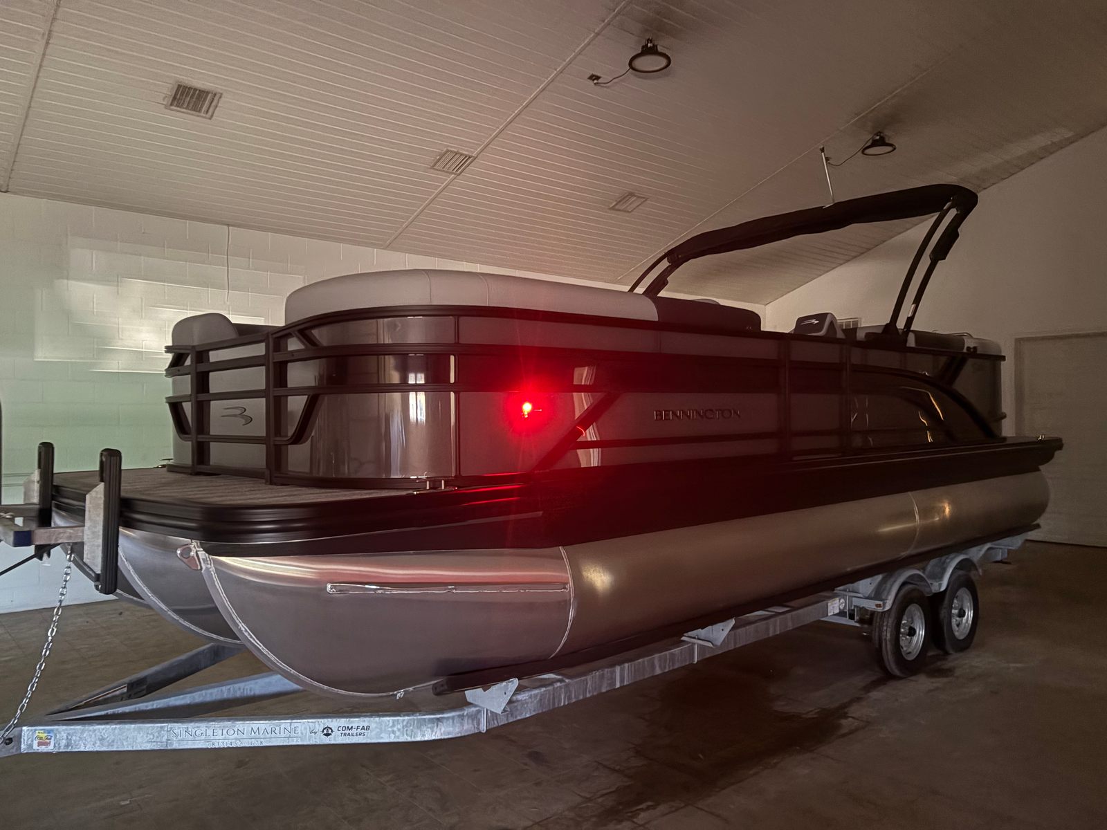 The Bennington 23 SSR SPS is packed with premium features that elevate your boating experience. The electric power top curved Bimini in black offers convenient shade and protection from the sun, allowing you to enjoy long afternoons on the water in comfort. The Serene Soft Touch Vinyl with Simtex accents creates a plush, inviting seating environment, while the Ironwood dash accent adds a touch of elegance to the helm. The Blackout Luxe Package (S) and blackout logos contribute to the boat’s striking visual appeal, ensuring it stands out in any marina.The Midnight Black canvas and Shadow Gray details not only enhance the boat’s aesthetics but also provide durability and resistance to the elements. The dual switch battery system with fuse ensures reliable power management, so you can focus on enjoying your time on the water without worry. Every detail of this pontoon boat has been thoughtfully designed to maximize comfort, style, and functionality.
