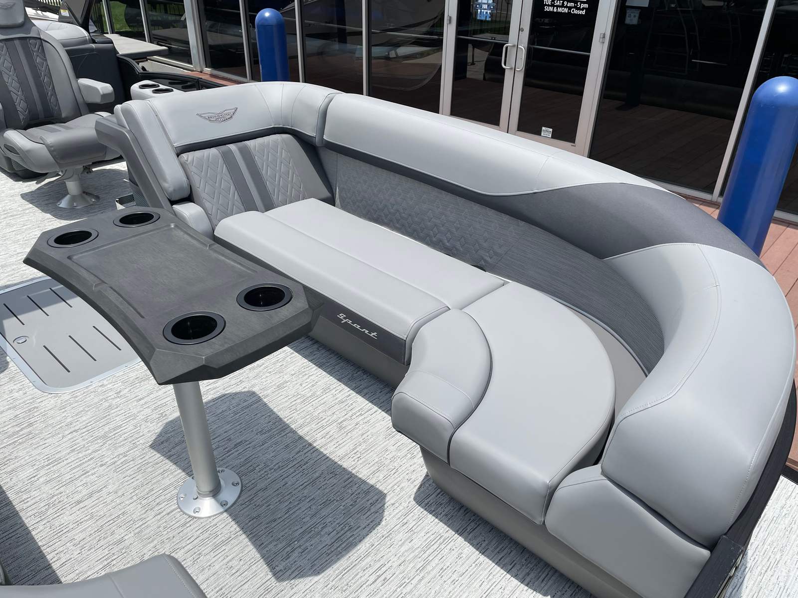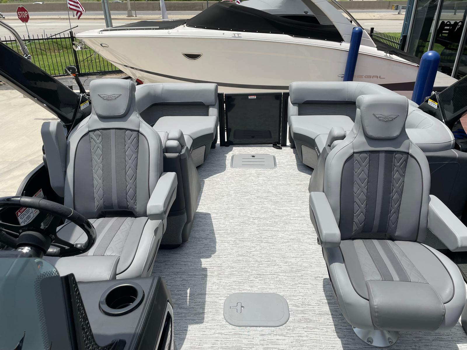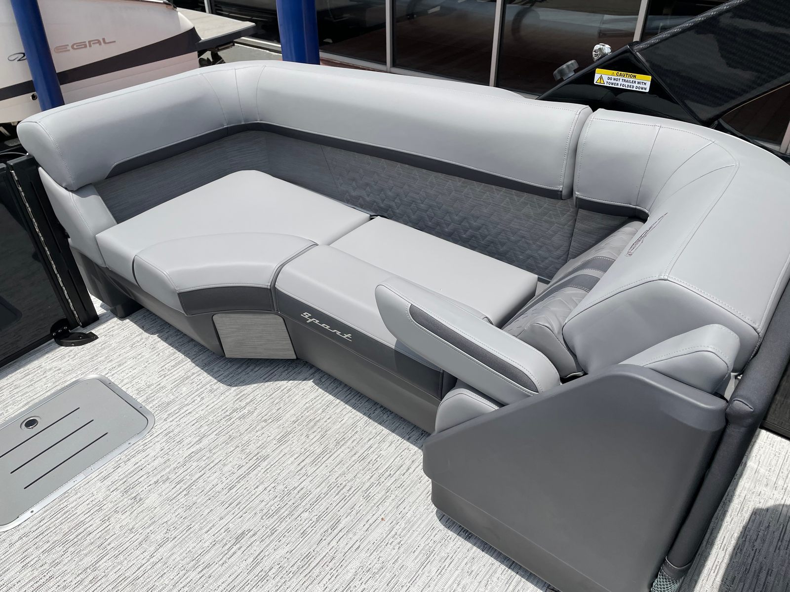 The Bennington 24 MFB SPS Plus is loaded with special features that elevate your time on the water. Enjoy a vibrant atmosphere with RGB speakers that let you set the mood with customizable lighting and high-quality sound. The toekick lights, with two 41-inch and two 62-inch fixtures, add a stylish glow to the deck, while lumbar lighting enhances both safety and ambiance during evening cruises. The Sport Furniture M Series provides plush, ergonomic seating for maximum comfort, and the Zebrawood Matte Slate accents add a touch of modern elegance to the interior.For those who love water sports, the ski tow bar makes it easy to enjoy tubing, wakeboarding, or skiing with friends and family. The Valencia Grey color scheme gives the boat a sophisticated, contemporary look, complemented by the black rub rail insert for added durability and style. Every detail of the Bennington 24 MFB SPS Plus is crafted to deliver a premium boating experience.