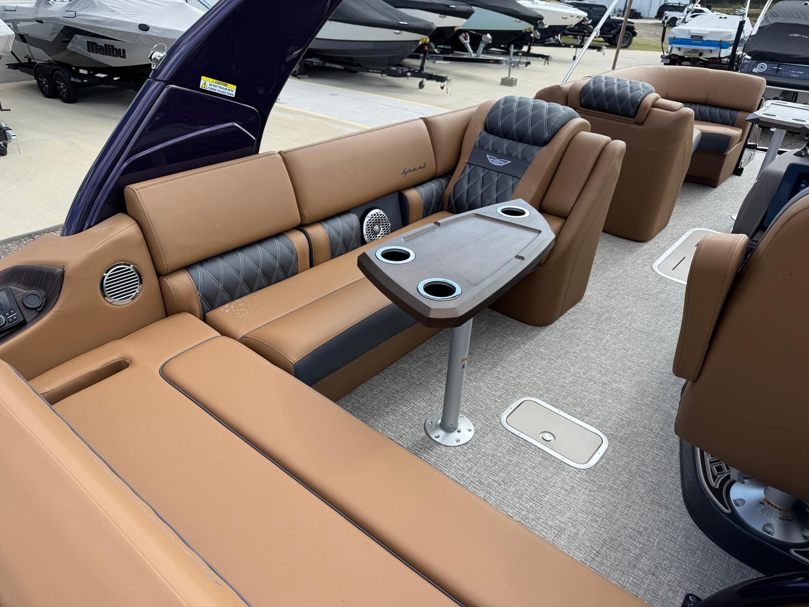 The Bennington 25 Qsba ESP is packed with special features that enhance both its aesthetic appeal and onboard experience. The Power Cladded Sport Arch adds a bold, sporty look while providing functional support for accessories and lighting. Illuminated cupholders and underwater lighting create a vibrant atmosphere for evening cruises, while toekick lights add a touch of elegance and safety. The blackout logos give the boat a sleek, modern appearance that stands out on the water.Entertainment is taken to the next level with a premium Rockford Fosgate audio system, including six 6.5" M2 speakers throughout the boat and two additional speakers on the arch. The sound system is further enhanced by a 10" M2 subwoofer, a PM Punch amplifier upgrade, a Rockford Fosgate 10" M1 subwoofer, and a dual M2 amplifier upgrade, ensuring crystal-clear sound and powerful bass for your favorite music. The removable flag pole with an American flag adds a patriotic touch, perfect for holiday celebrations or showing your pride on the water.