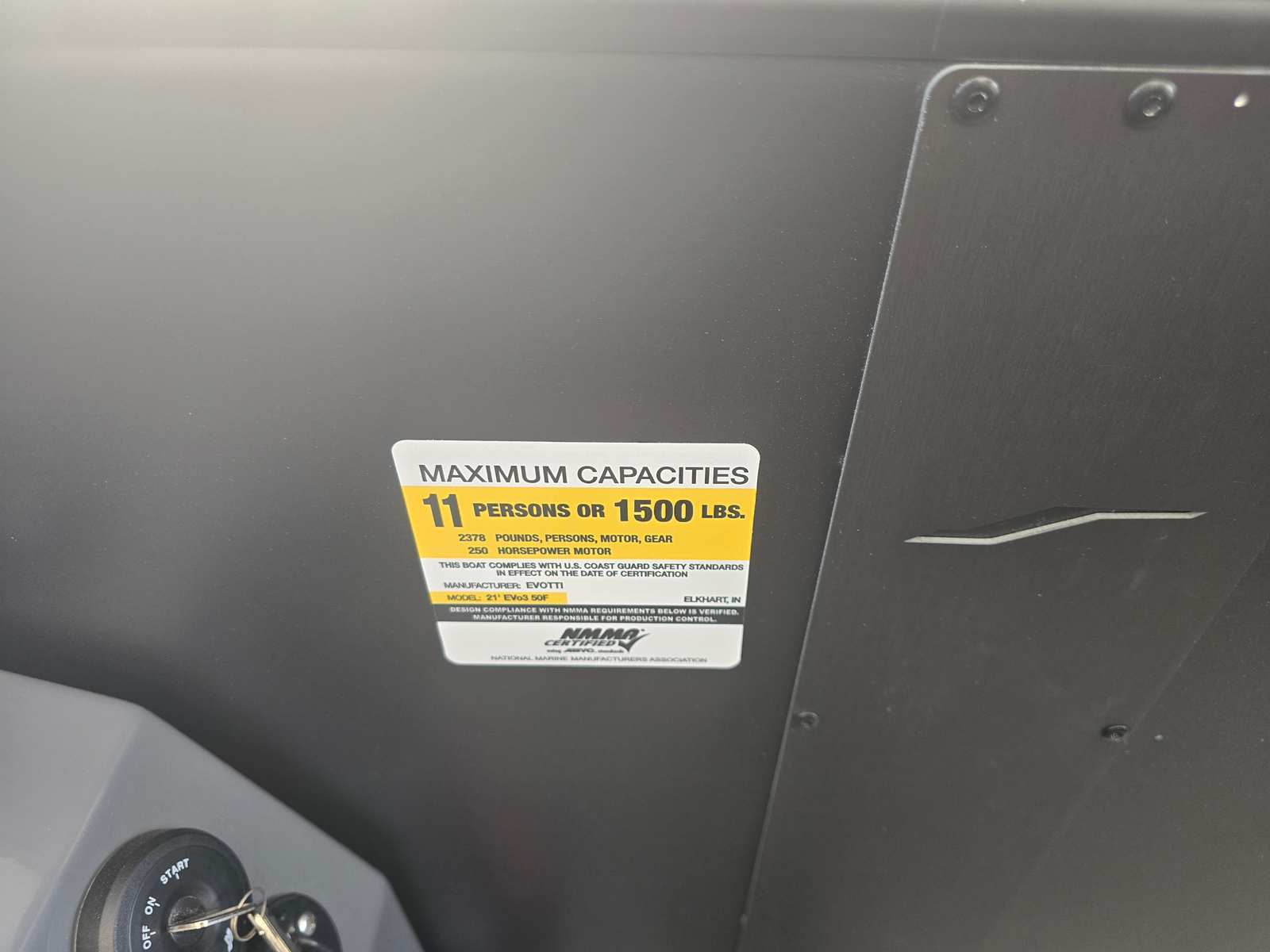 The 2026 Evotti 521 CS is loaded with premium features that enhance both aesthetics and functionality. The exterior boasts a sophisticated Panel Diamond Black Satin finish, complemented by a striking Panel Accent Pearl White Gloss that adds a touch of elegance and modern flair. The Canvas Black provides durable protection from the elements, ensuring your boat remains in top condition throughout the seasons.Step aboard and experience the comfort of the Base Vinyl Steel Gray upholstery, which offers a sleek, contemporary look while providing exceptional durability and easy maintenance. The Steel Gray Evolution Flooring not only adds to the boat’s visual appeal but also delivers a non-slip, comfortable surface that is perfect for barefoot relaxation or active days on the water.Safety is a top priority, and the inclusion of stern safety chains provides added peace of mind for you and your passengers. The battery dual system ensures reliable power for all your onboard electronics and accessories, so you can focus on enjoying your time on the water without worry.
