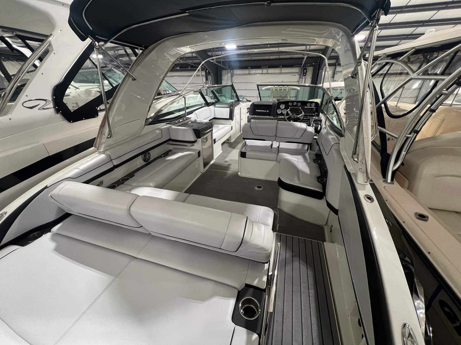 Owning the Formula 330 CBR cruiser means embracing a lifestyle of fun, relaxation, and adventure. The spacious layout is perfect for entertaining friends and family, offering ample seating and room to move about. The comfortable cabin and climate control features ensure everyone stays cozy, whether you’re escaping the summer heat or enjoying a crisp autumn evening on the water. The premium sea grass flooring in the cockpit adds both style and practicality, making cleanup after a day of fun effortless. Socializing is a breeze on this cruiser boat for sale, with plenty of space for dining, lounging, and enjoying the company of loved ones. The bimini top and camper enclosure provide flexible options for sun and shade, so you can tailor your experience to suit the weather and your preferences. Whether you’re hosting a sunset cocktail party or embarking on a weekend adventure, the Formula 330 CBR delivers the perfect setting for memorable moments.