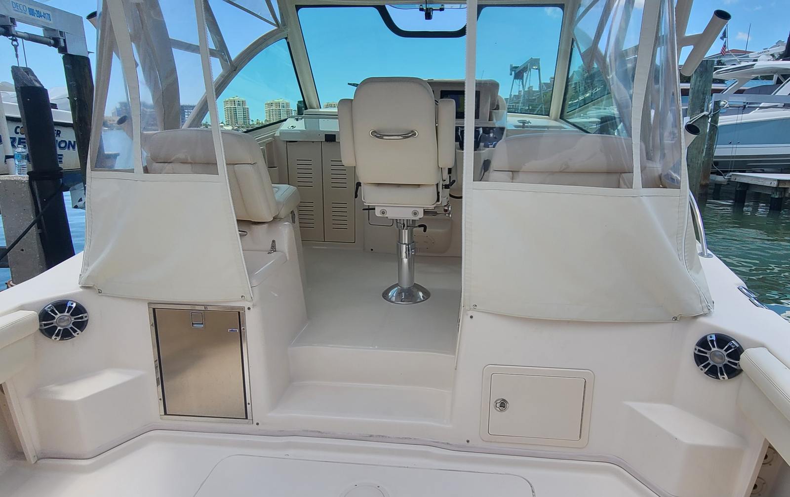 Powered by twin engines delivering a combined 850 horsepower, the Grady-White Express 330 offers exhilarating performance and responsive handling. The dual-engine setup ensures smooth acceleration, impressive top speeds, and enhanced maneuverability, whether you’re navigating tight marinas or heading out to your favorite fishing spot. With only 195 engine hours, these motors promise years of dependable service, giving you confidence every time you set out on the water. The Express 330’s advanced hull design further contributes to a stable, dry ride, even in choppy conditions, making it a standout among fishing boats for sale.