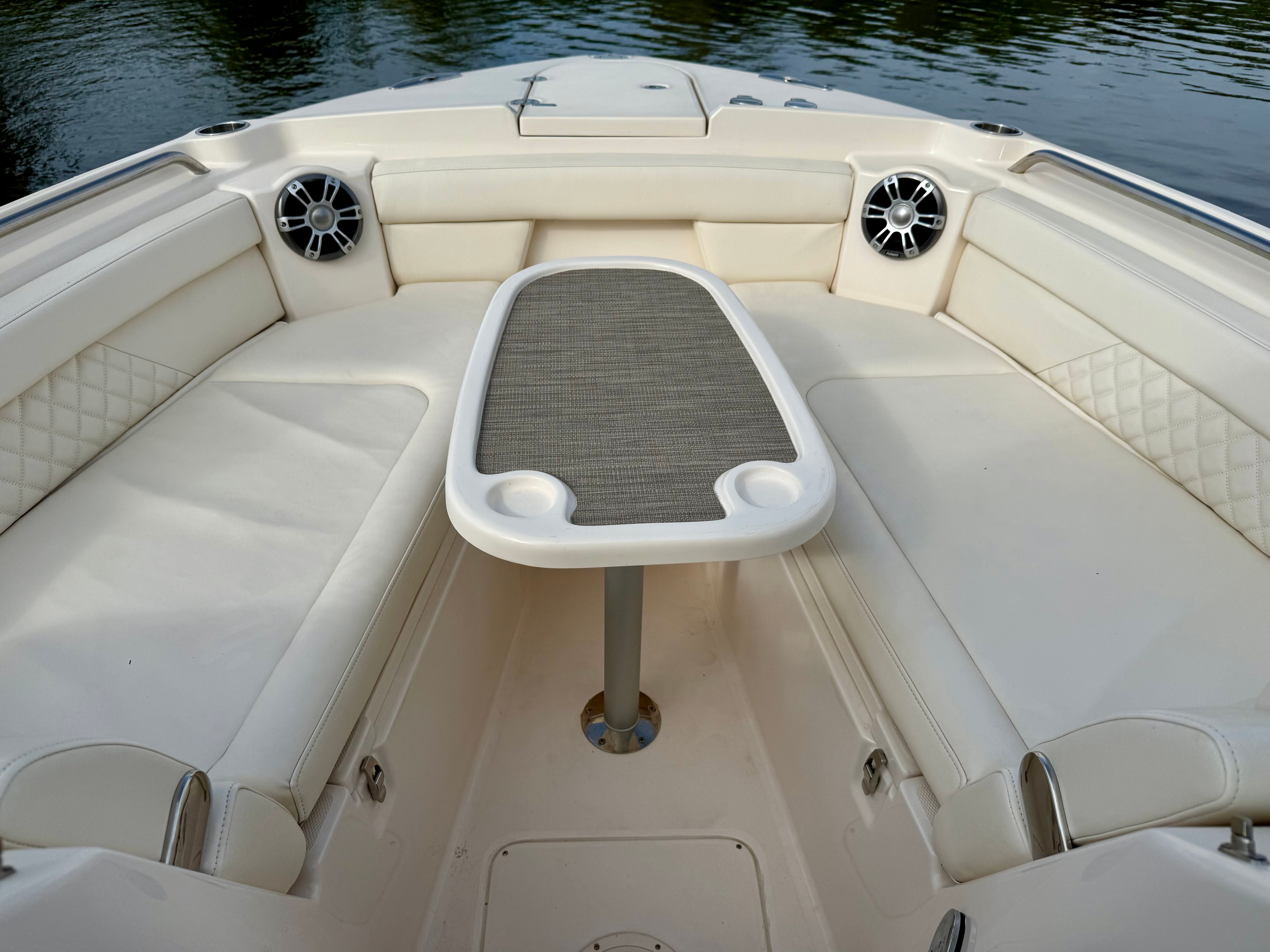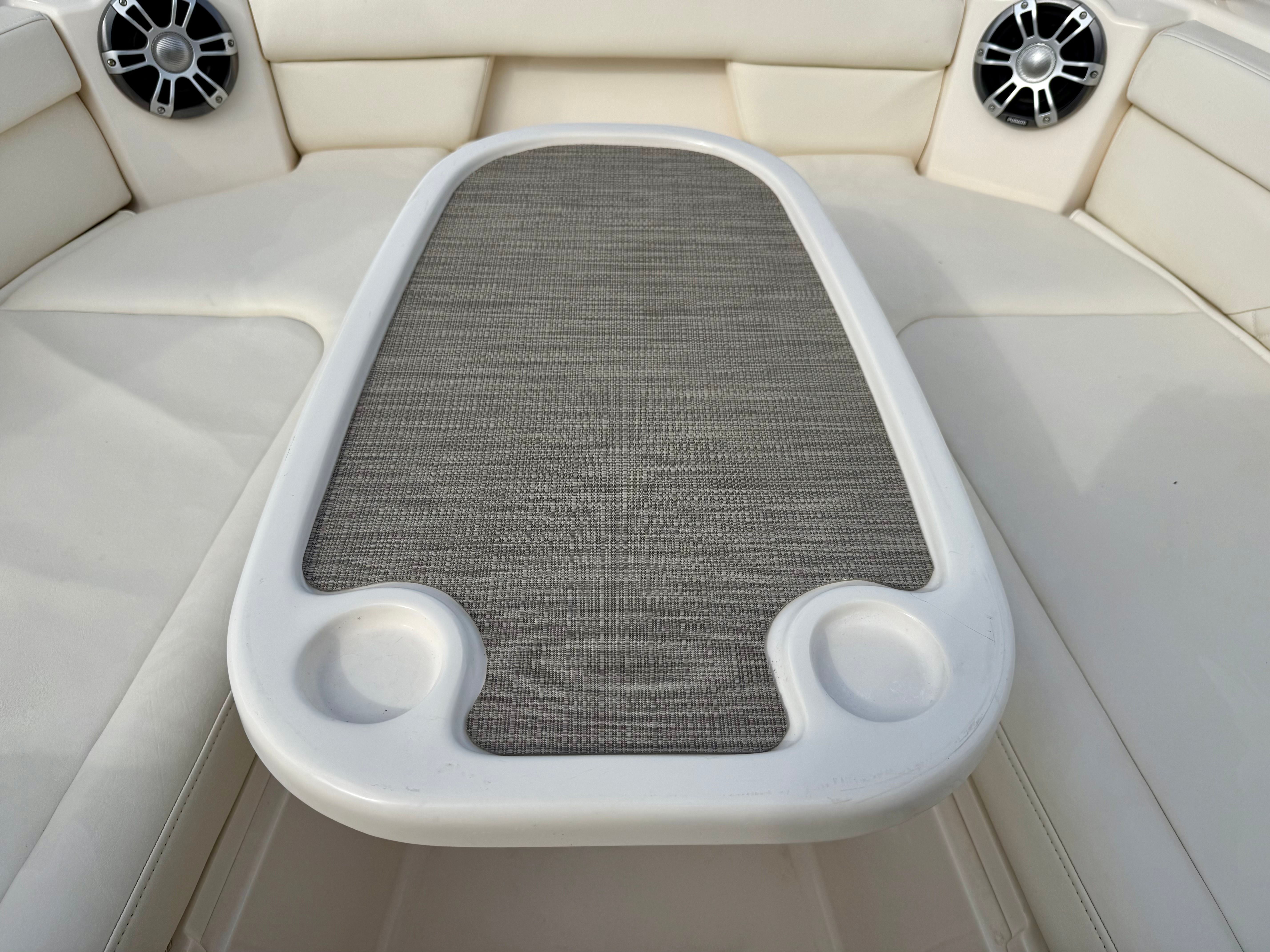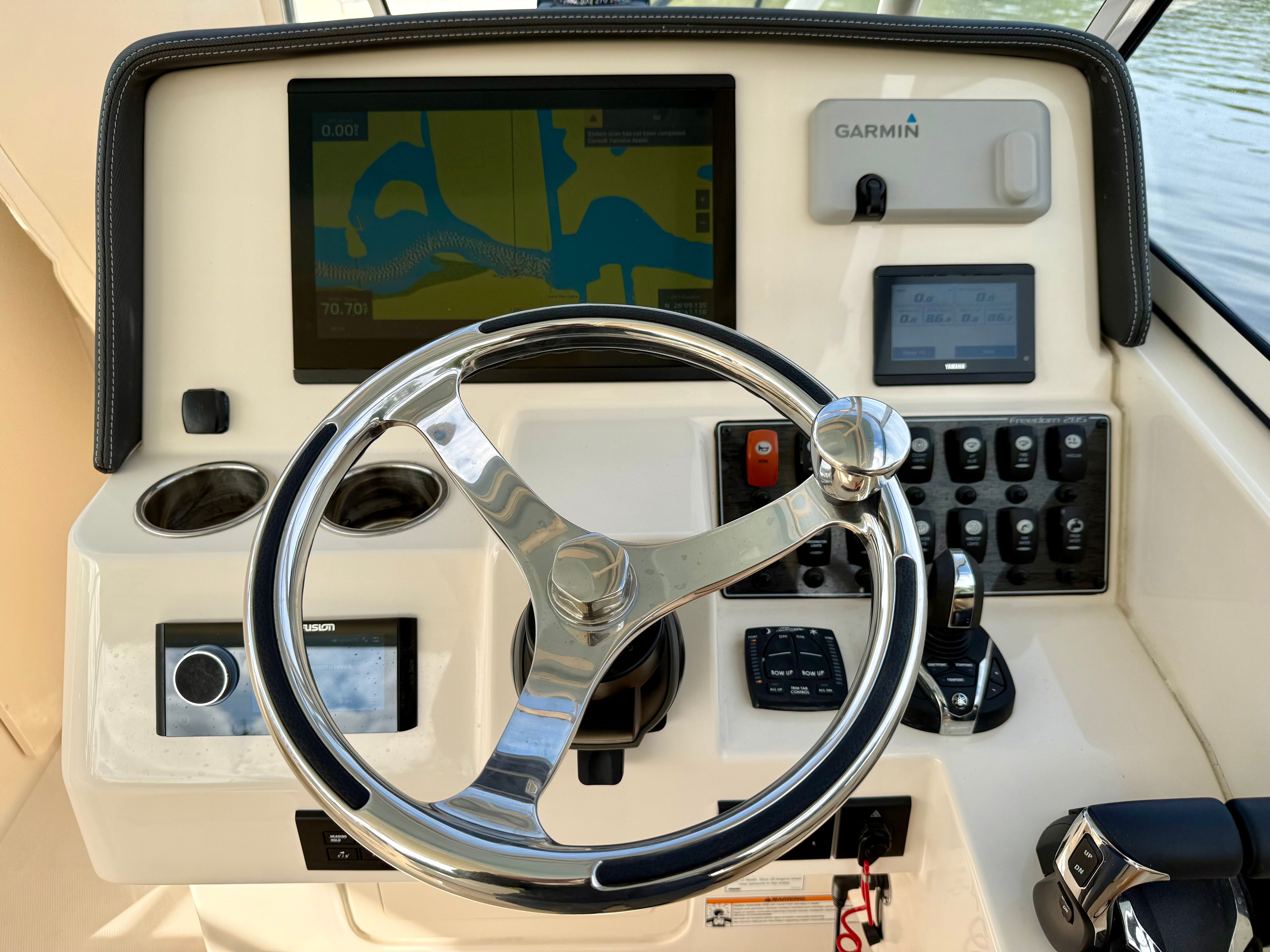 This 285 Freedom is well equipped with a thoughtfully selected list of value-added features designed to enhance comfort, safety, and enjoyment for the entire crew. At the helm you’ll find a Garmin 16-inch navigation display with sonar, providing clear, intuitive charting and fish-finding capabilities. Yamaha Helm Master with joystick control and Yamaha autopilot make docking and long runs effortless, even for less experienced operators. Entertainment is handled by a premium Fusion stereo system with bow-to-stern speakers, ensuring great sound throughout the boat.