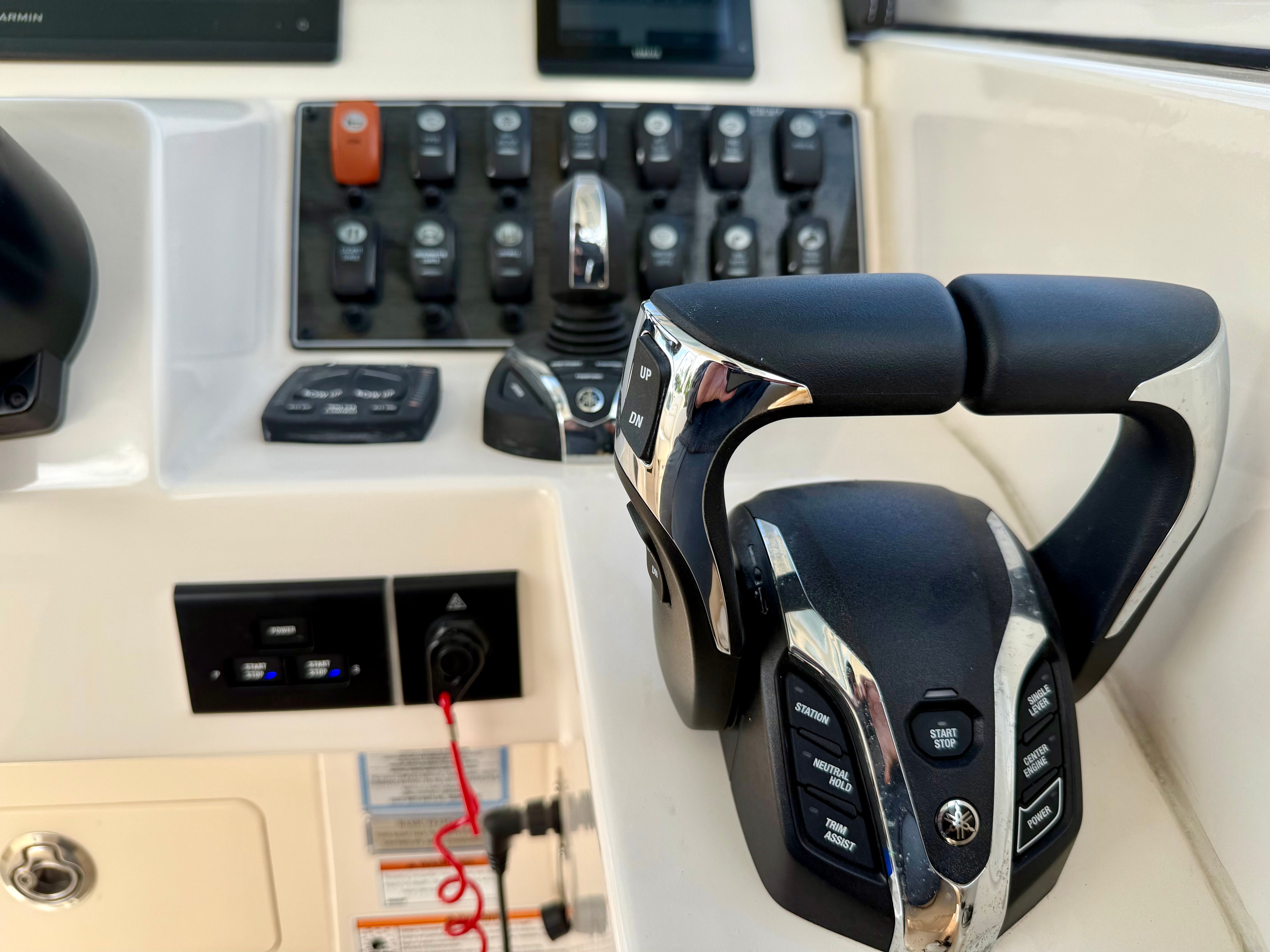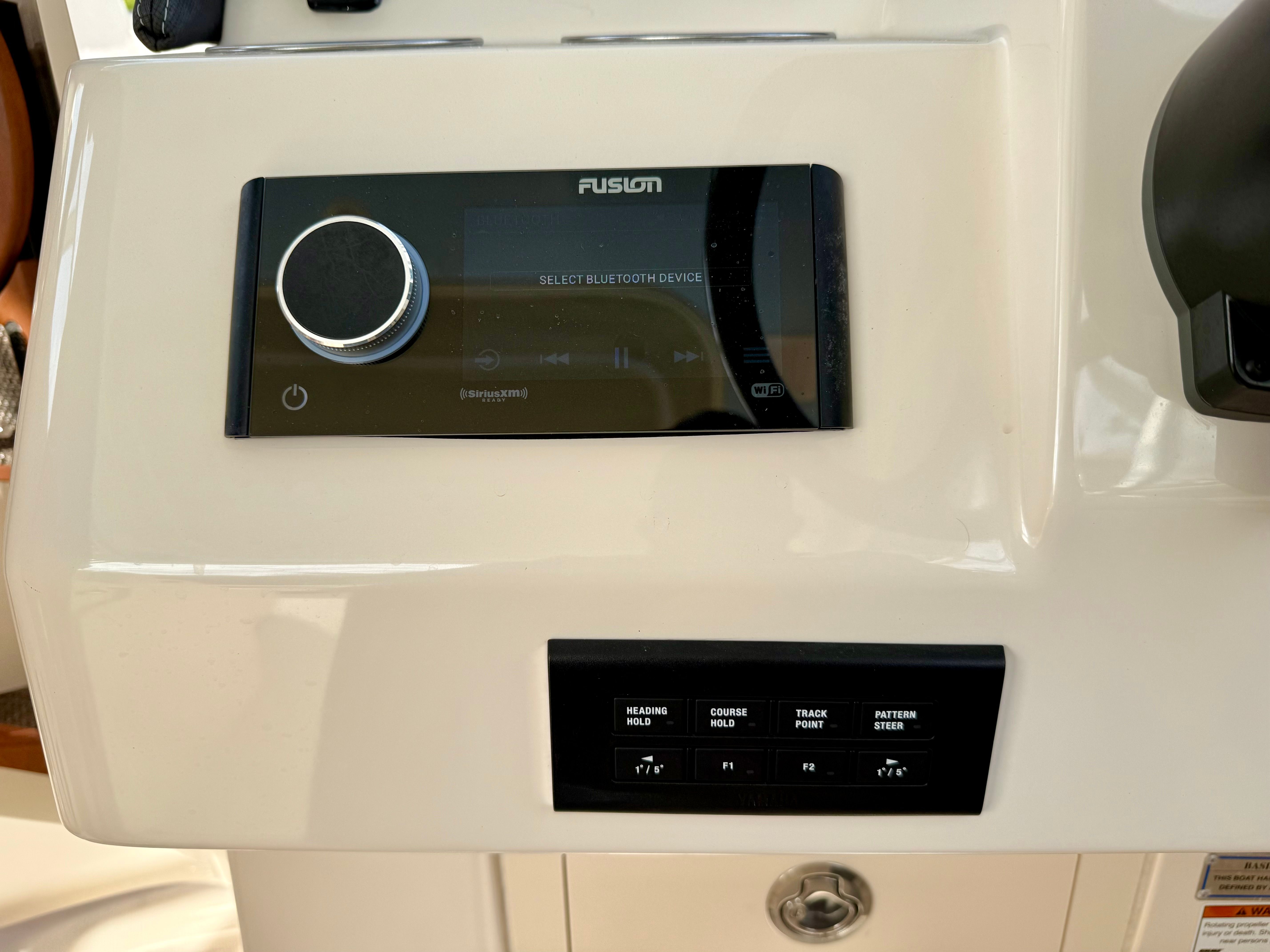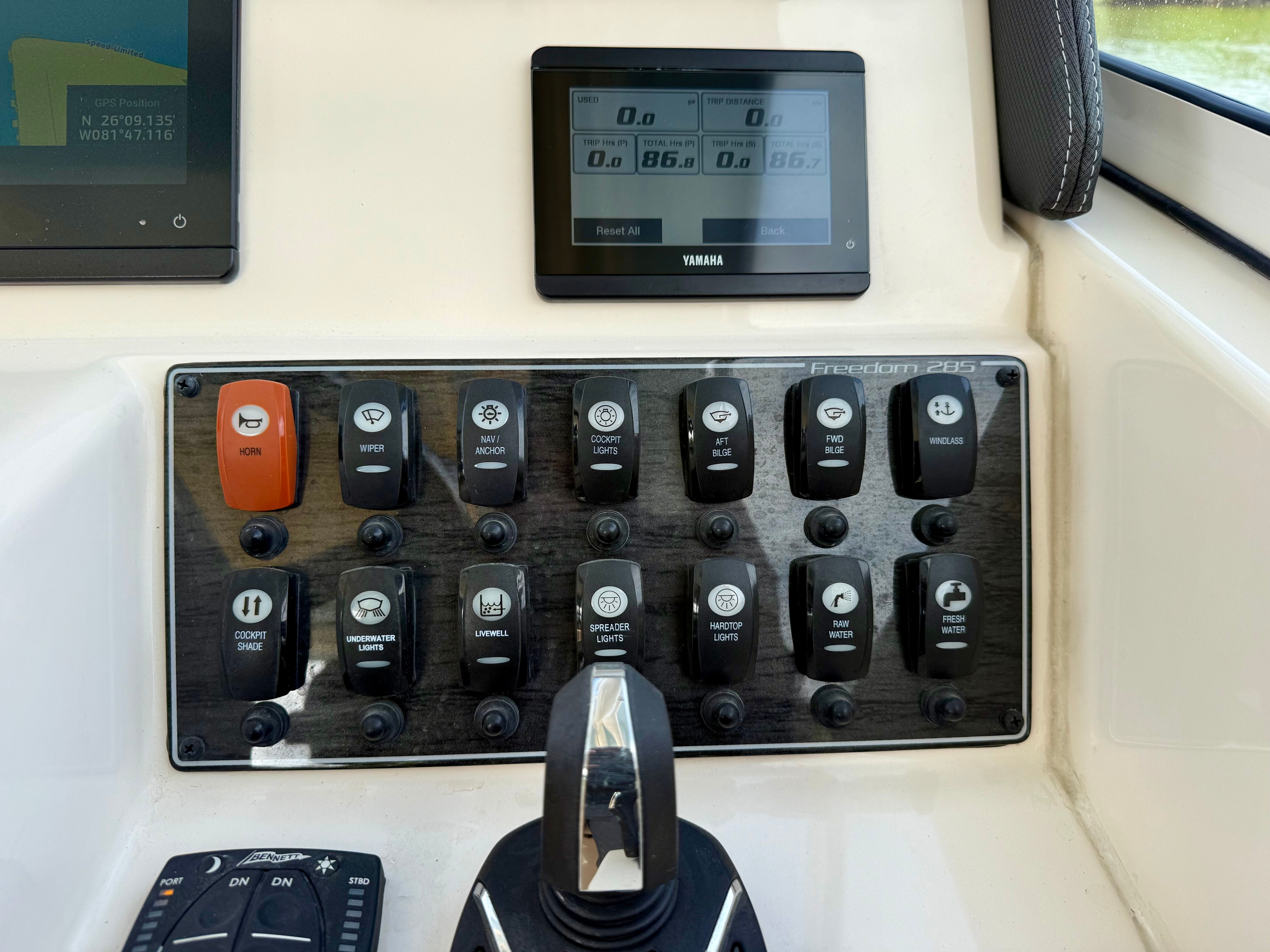 This 285 Freedom is well equipped with a thoughtfully selected list of value-added features designed to enhance comfort, safety, and enjoyment for the entire crew. At the helm you’ll find a Garmin 16-inch navigation display with sonar, providing clear, intuitive charting and fish-finding capabilities. Yamaha Helm Master with joystick control and Yamaha autopilot make docking and long runs effortless, even for less experienced operators. Entertainment is handled by a premium Fusion stereo system with bow-to-stern speakers, ensuring great sound throughout the boat.