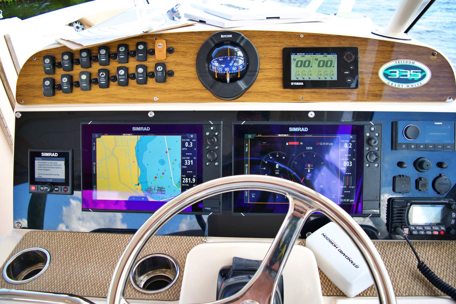 The Grady-White 335 Freedom is packed with features that enhance both functionality and enjoyment on the water. Its dual console layout offers versatility, allowing for easy transitions between cruising, fishing, and entertaining. The spacious cockpit and bow seating areas provide plenty of room for guests to relax and socialize, while the well-designed helm with modern Simrad radar and navigation displays ensures that the captain has everything needed for a smooth and enjoyable ride.This model is known for its high-quality construction and attention to detail, with premium materials used throughout. The overall length offers generous deck space, making it ideal for hosting gatherings or enjoying a peaceful day on the water. The dual console design also provides excellent protection from the elements, allowing you to extend your boating season and enjoy your investment in a variety of weather conditions.