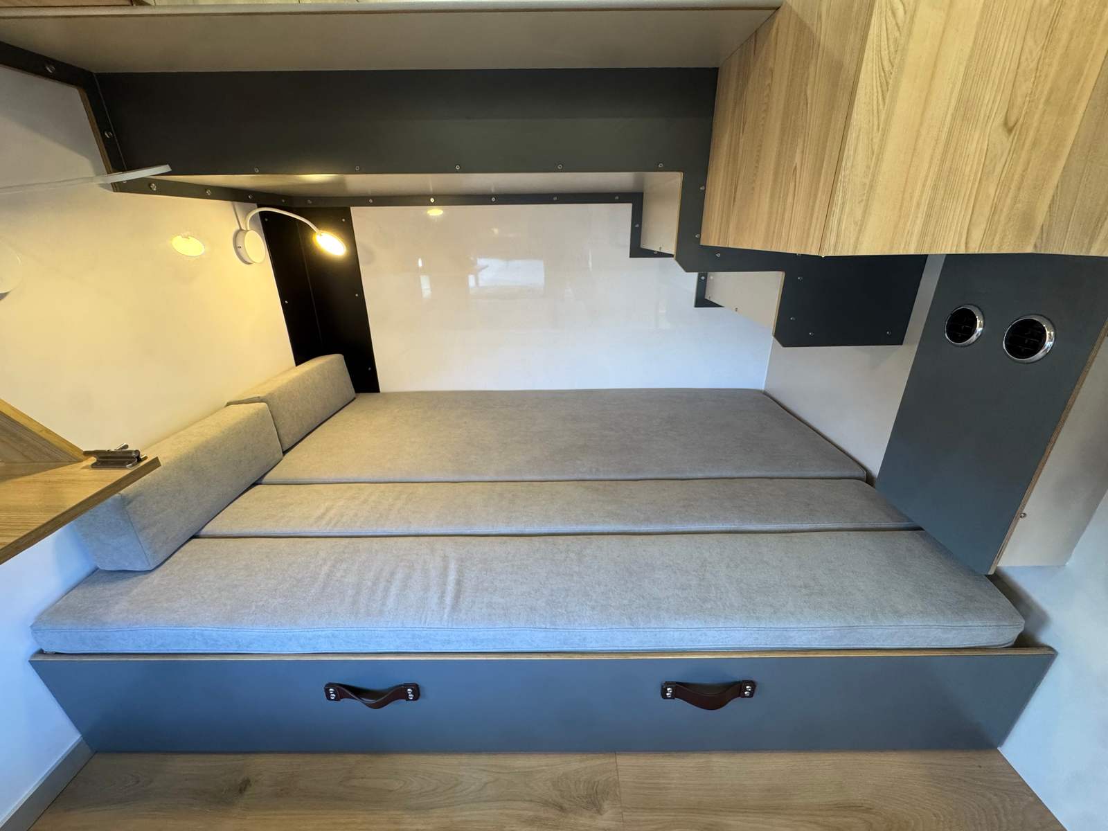 - Front cupboard with counter top in upper cabin