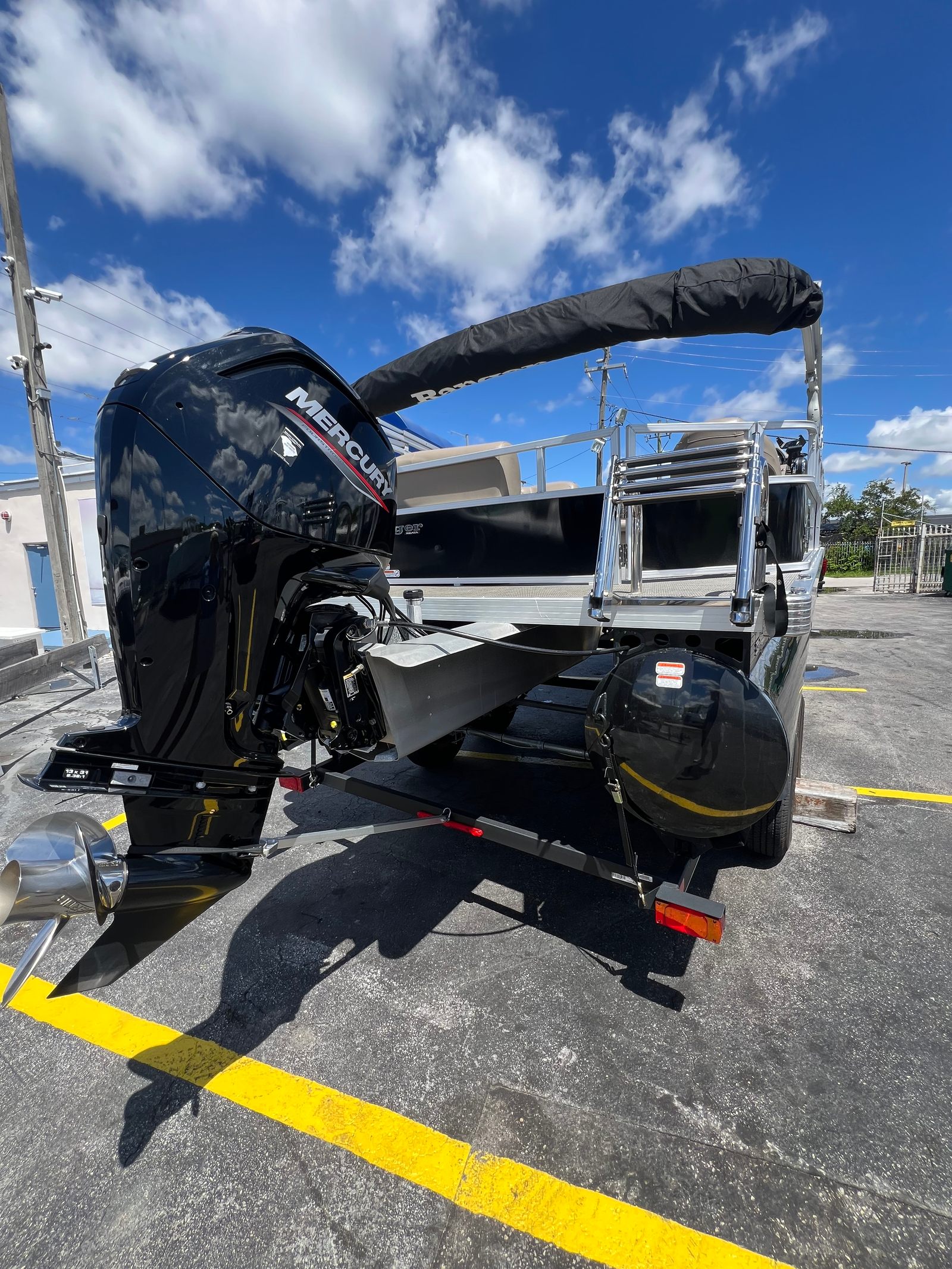 Shade & lighting: EasyLift™ Bimini top (10-foot) with LED courtesy lights, storage pockets, protective boot; LED navigation lighting; anchor/navigation light mounted on Bimini.