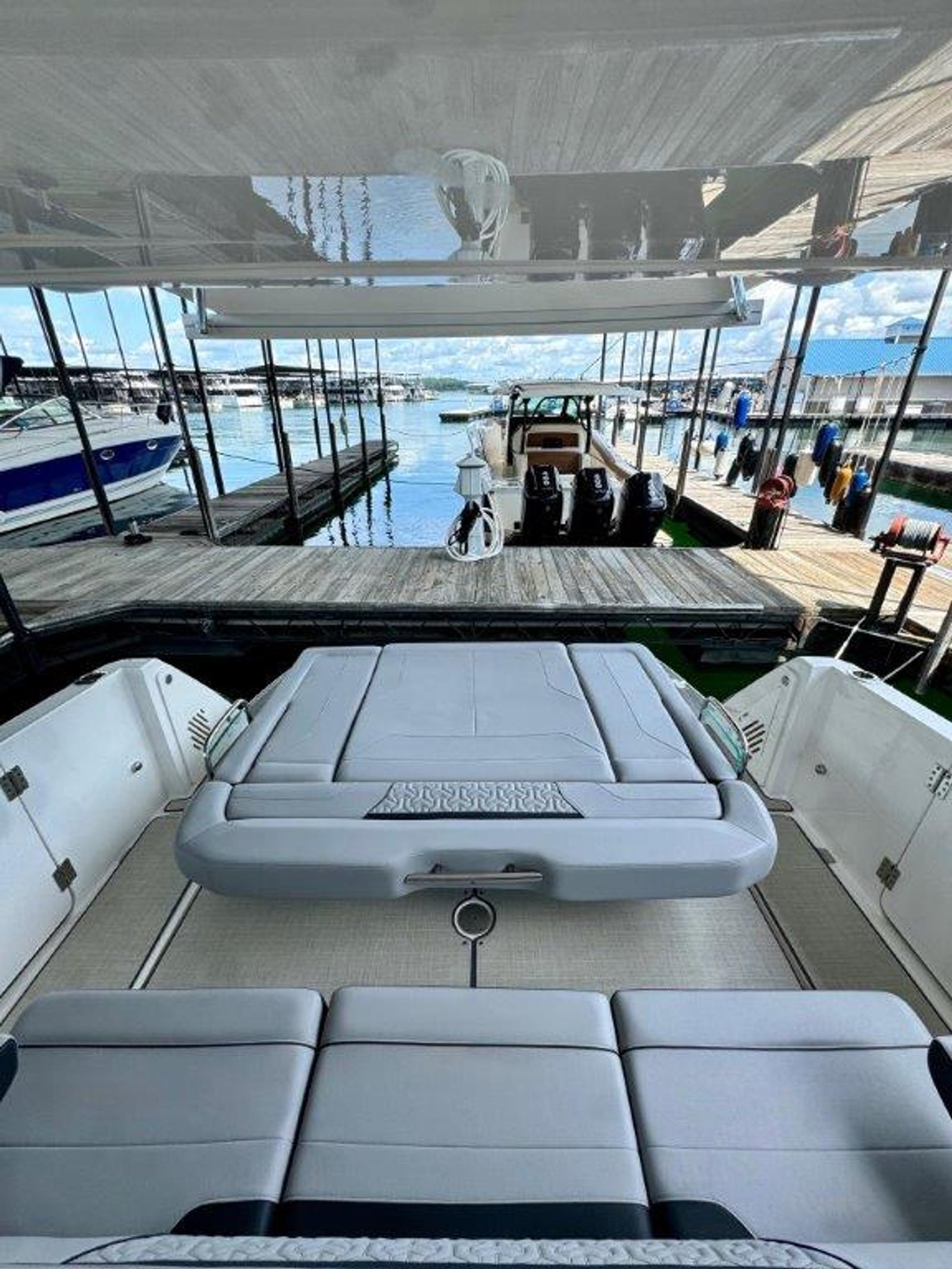 This particular 38 Surf is equipped with a wide range of upgrades designed for comfort, entertainment, and time on the water. Highlights include digital switching, cockpit and cabin A/C and heat, bow thruster, electric aft shade, cockpit TV, cockpit grill, dual cockpit refrigerators, and the Ultimate JL Audio package with satellite tuner and antenna. Additional features include the Ultimate RGBW underwater lighting package, underwater power platform with ReFLEX swim platform, windlass with rope and chain, Garmin VHF radio, cockpit Seagrass flooring, stainless steel upgrade package, bow and seat covers, toasted oak salon flooring, and mosaic countertops.