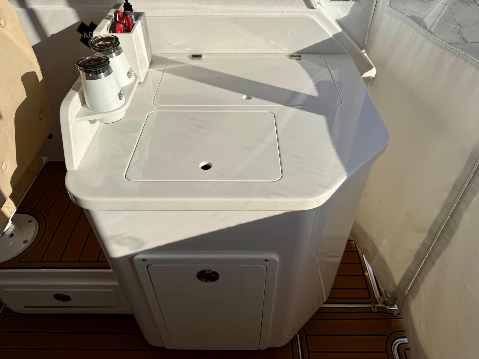 At the helm, you’ll find twin Garmin 16-inch navigation displays with integrated sonar, offering crystal-clear charts, fishfinding capability, and full system integration. A Garmin radar system enhances visibility and safety when running offshore or navigating in limited visibility, and the onboard autopilot allows for stress-free cruising on longer runs. Entertainment is handled by a premium Fusion stereo system with bow-to-stern speakers, delivering rich, balanced sound whether you’re entertaining at anchor or underway.