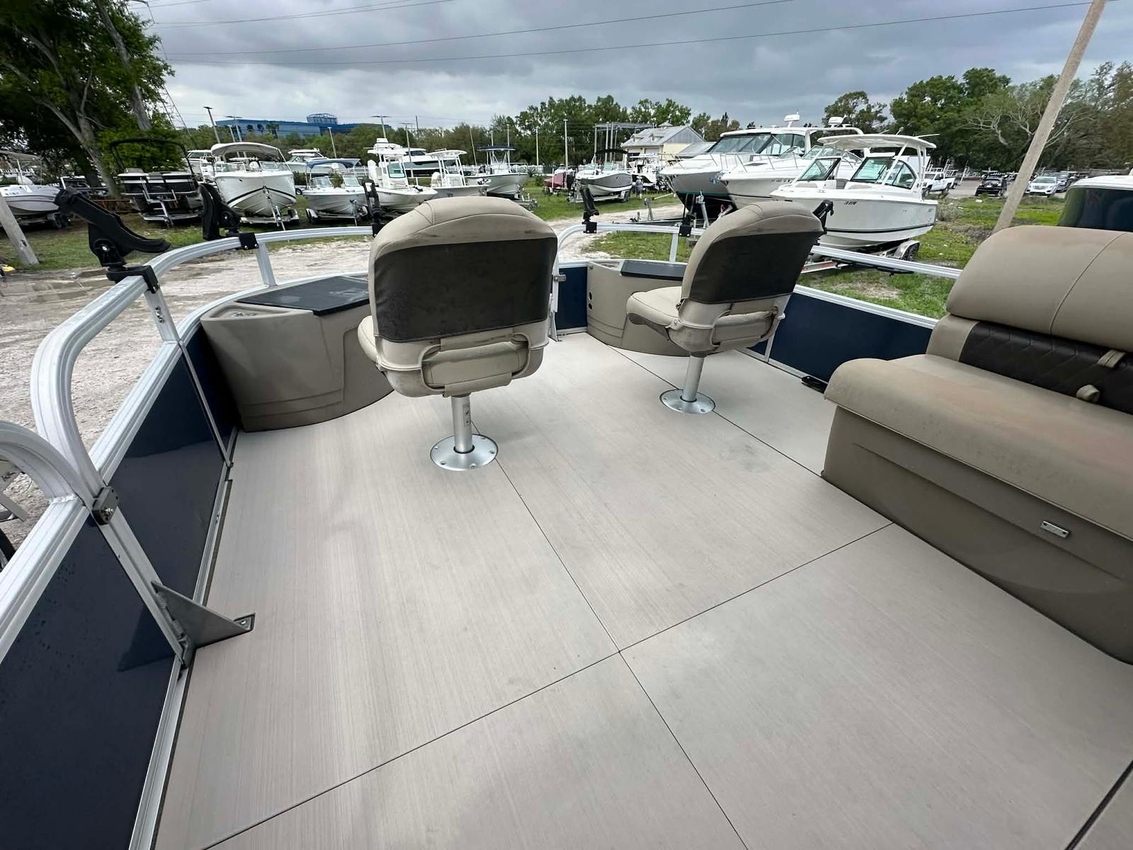 The SunTracker Fishin’ Barge 22 XP3 is the perfect combination of family cruising and serious fishing capability. Built on Tracker’s XP3 performance tritoon package, this boat delivers improved stability, speed, and handling compared to traditional pontoons. Powered by a Mercury 150HP outboard with only 80 hours, it has plenty of power for cruising, pulling tubes, or running to your favorite fishing spots.